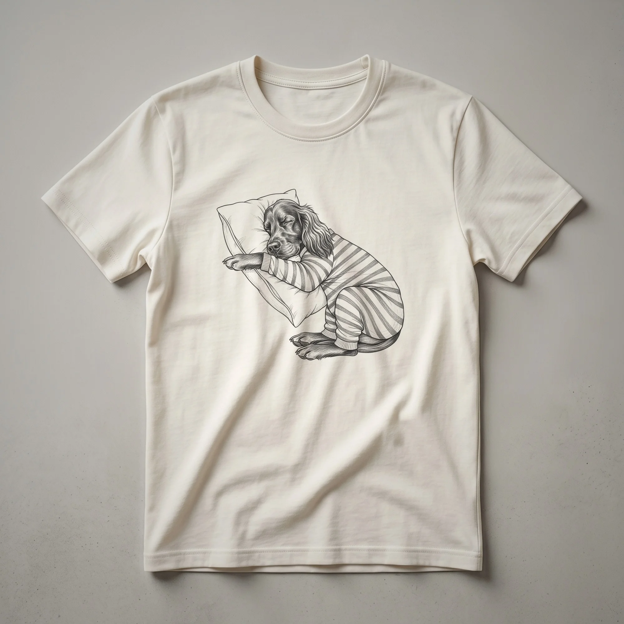 Irish Setter owners who appreciate the breed's elegant appearance and gentle nature will adore this unique graphic tee. The design showcases a charming line drawing of a sleeping Irish Setter, complete with cozy pajamas, capturing the essence of a peaceful slumber. Irish Setters, known for their striking mahogany coats and energetic personalities, are often depicted in active poses, making this serene depiction a delightful contrast. This artistic representation highlights the breed's affectionate and playful spirit, even in repose. This comfortable shirt is a thoughtful gift for any dog mom, dog dad, or anyone who cherishes their canine companion. It's a staple in the collection for those who love to express their passion for their furry friends. Imagine wearing this t-shirt while relaxing at home, enjoying a quiet morning with your own Irish Setter, or heading out for a casual outing. It’s a conversation starter for fellow dog lovers and a sweet reminder of the joy dogs bring into our lives. This tee works well for anyone who enjoys unique dog-themed apparel and wants to showcase their love for this beautiful breed in a whimsical way.