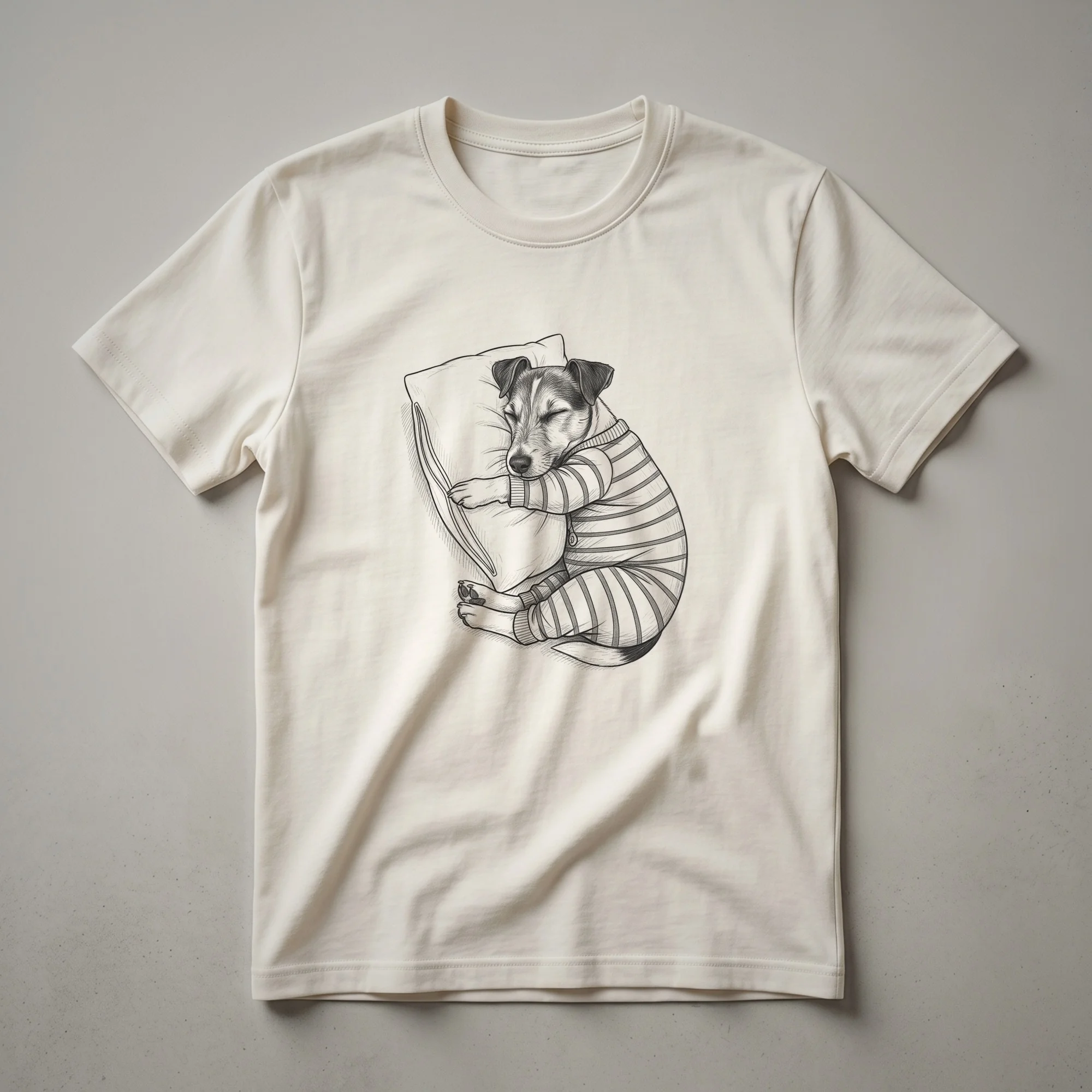 Jack Russell Terrier owners know the breed's energetic spirit, but this charming graphic tee celebrates their quieter moments. The design features a delightful drawing of three Jack Russell terriers, each sporting cozy pajamas, all peacefully asleep. This artistic rendering captures the endearing nature of these spirited dogs when they finally settle down. Jack Russells are known for their intelligence and boundless energy, often used for fox hunting due to their tenacity and speed. This t-shirt is a wonderful way for any Jack Russell mom or dad to express their affection for their furry companions. It makes a thoughtful gift for birthdays, holidays, or just because for the dog lover in your life who appreciates a touch of whimsy. This comfortable shirt is a go-to tee for casual outings, lounging at home, or attending dog-themed events. Wear it to the dog park or while enjoying a quiet evening with your own sleepy pup.
