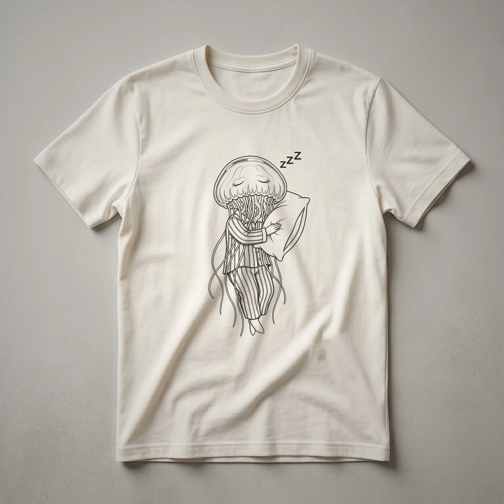 For those who find themselves constantly drifting off, this graphic tee features a charming illustration of a jellyfish clad in cozy pajamas, sound asleep. The drawing style is simple and whimsical, capturing the essence of a creature that embodies a relaxed, almost meditative state. Jellyfish, known for their graceful, undulating movements through the ocean's currents, are often seen as symbols of tranquility and flow. This t-shirt brings that serene, sleepy vibe to your everyday wear. It's a playful nod to anyone who cherishes their sleep or simply enjoys a good nap. This shirt works well for individuals who appreciate quirky humor and marine life. Imagine wearing this to a casual game night or a relaxed brunch with friends. It makes a thoughtful gift for the friend who always seems to be tired or the ocean lover in your life who dreams of underwater adventures. This comfortable tee is a go-to for lounging at home or making a statement about your love for sleep.