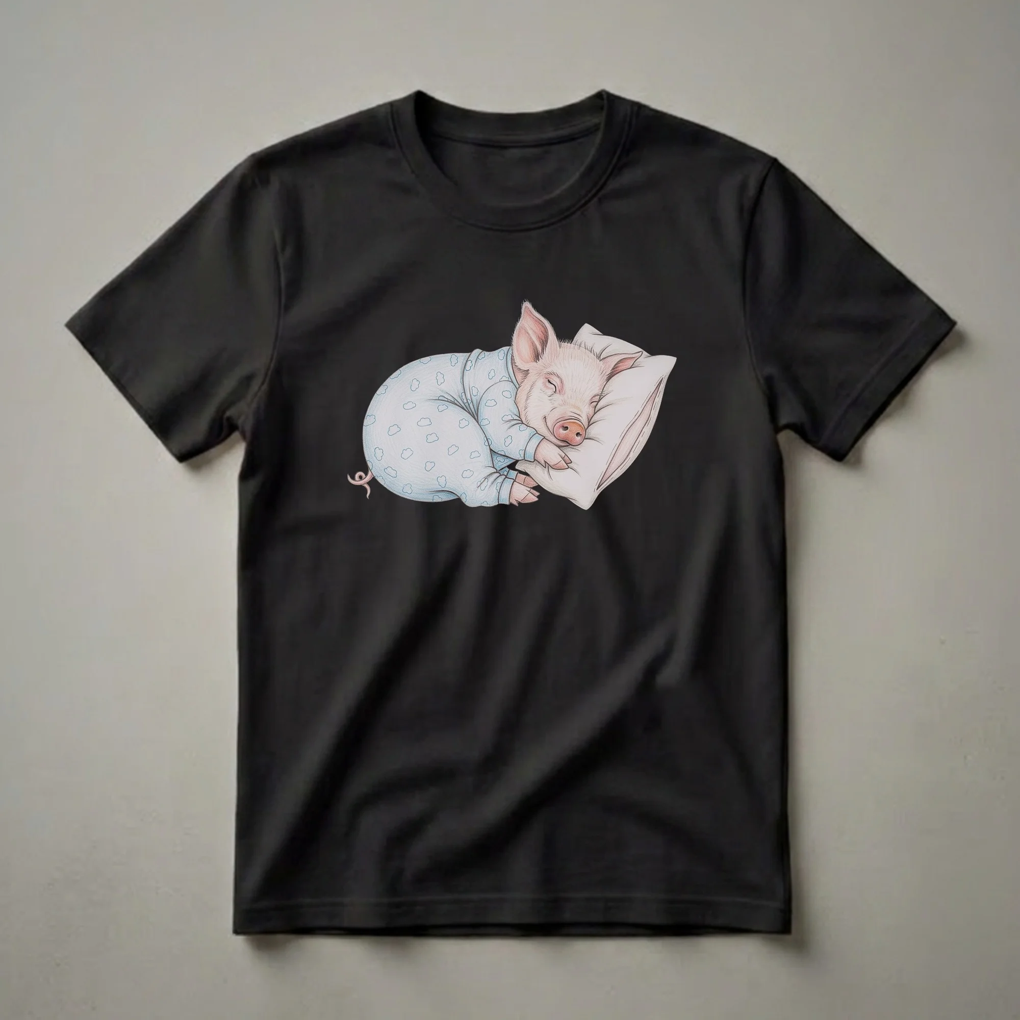 Pigs are known for their intelligence and social nature, often enjoying comfortable resting spots. This charming graphic tee captures that essence with a delightful drawing of a piglet sound asleep. The artwork showcases a small piglet curled up on a plush pillow, dressed in cozy blue pajamas adorned with a pattern of white clouds. The piglet's eyes are closed, and its expression is one of pure contentment, embodying the joy of a deep slumber. This t-shirt is a playful nod to anyone who appreciates the simple pleasure of a good nap or finds humor in the idea of animals in human attire. It's a staple in the collection for those who love whimsical animal designs. This tee works well for anyone who enjoys a good laugh or needs a reminder to relax. It makes a thoughtful gift for friends or family members who adore pigs or simply love a cozy aesthetic. Imagine wearing this to a casual game night or a relaxed brunch with friends, sparking smiles and conversations about the adorable artwork. The detailed drawing style adds a touch of artistry, making this more than just a funny shirt; it's a wearable piece of art that celebrates the comfort of sleep.
