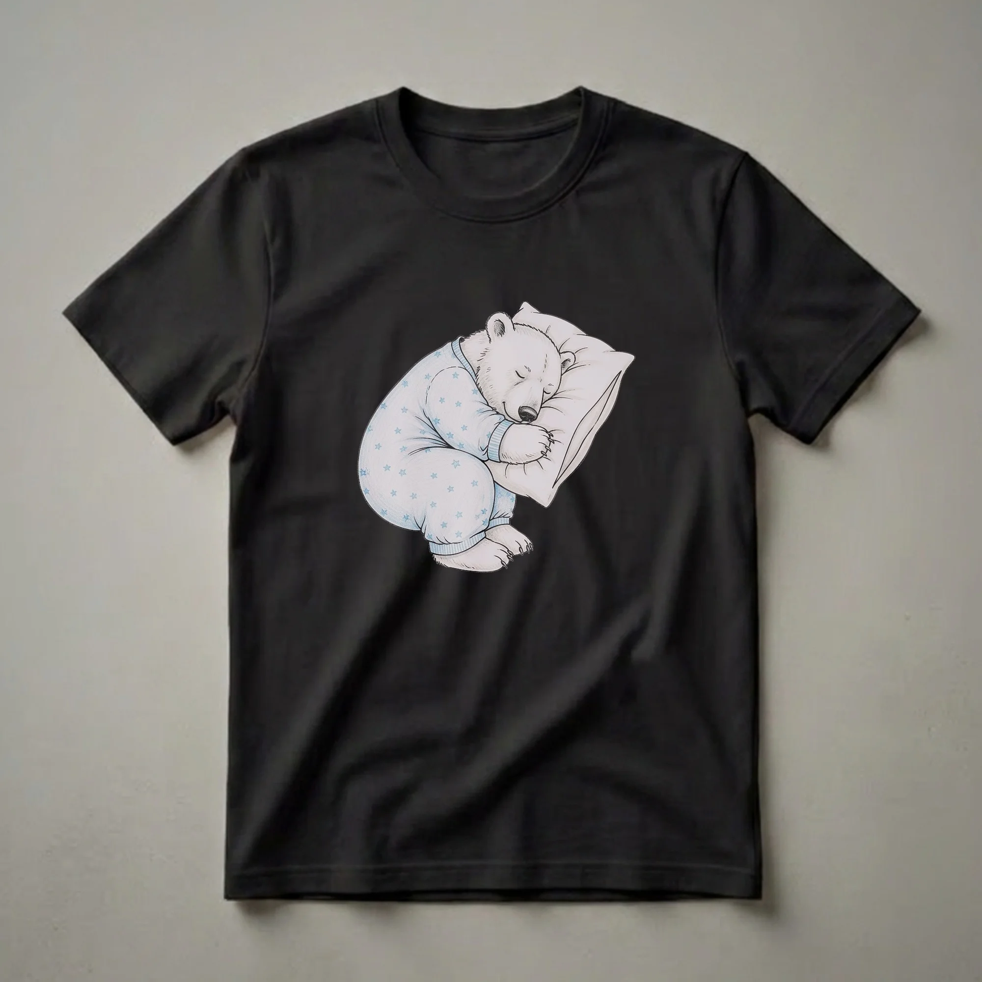 Polar bear enthusiasts who appreciate a good nap will reach for this charming graphic tee. The artwork showcases a sweet polar bear curled up soundly on a plush pillow, dressed in light blue pajamas adorned with a pattern of small, light blue stars. The bear's eyes are closed, and its paws are tucked in, conveying a sense of deep slumber. This t-shirt captures the universal desire for rest and relaxation, making it a relatable piece for anyone who loves animals and comfort. Polar bears, known for their impressive size and adaptation to Arctic environments, are often depicted as powerful creatures, but this design offers a softer, more whimsical perspective. This shirt works well for individuals who identify with the bear's sleepy disposition or simply find the illustration endearing. It makes a thoughtful gift for friends or family members who are always ready for a cozy night in or who appreciate unique, artistic apparel. Wear this tee to your next pajama party, a casual brunch, or simply while enjoying a lazy weekend morning at home. It’s a fun way to express your love for animals and your appreciation for a peaceful moment.