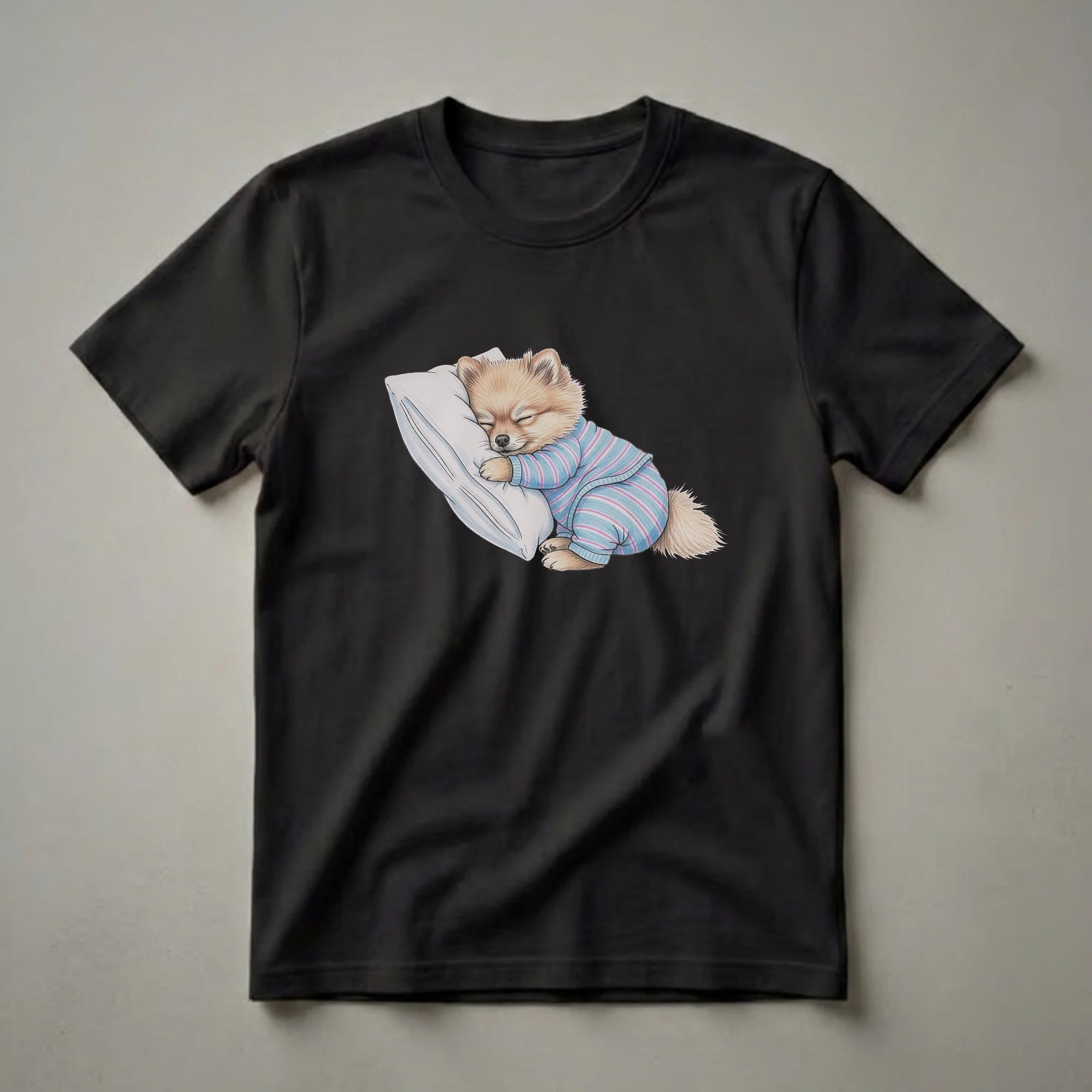 Pomeranian owners know the breed's fluffy coat and spirited personality, but this graphic tee showcases a different side: pure relaxation. This eye-catching t-shirt features a detailed drawing of a Pomeranian dog sound asleep on a plush pillow. The dog is dressed in cozy blue and pink striped pajamas, complete with matching cuffs and collar. The art style evokes a vintage feel, making this shirt a unique addition to any dog lover's wardrobe. Pomeranians, originating from the Pomerania region of Central Europe, are known for their intelligence and playful nature, but even these energetic pups need their rest. This tee is a thoughtful gift for any Pomeranian mom or dad who cherishes their furry companion's downtime. Wear this comfortable shirt to relax at home, enjoy a casual brunch, or share a smile with fellow dog enthusiasts. It's a staple in the collection for anyone who adores these small, fox-like dogs.