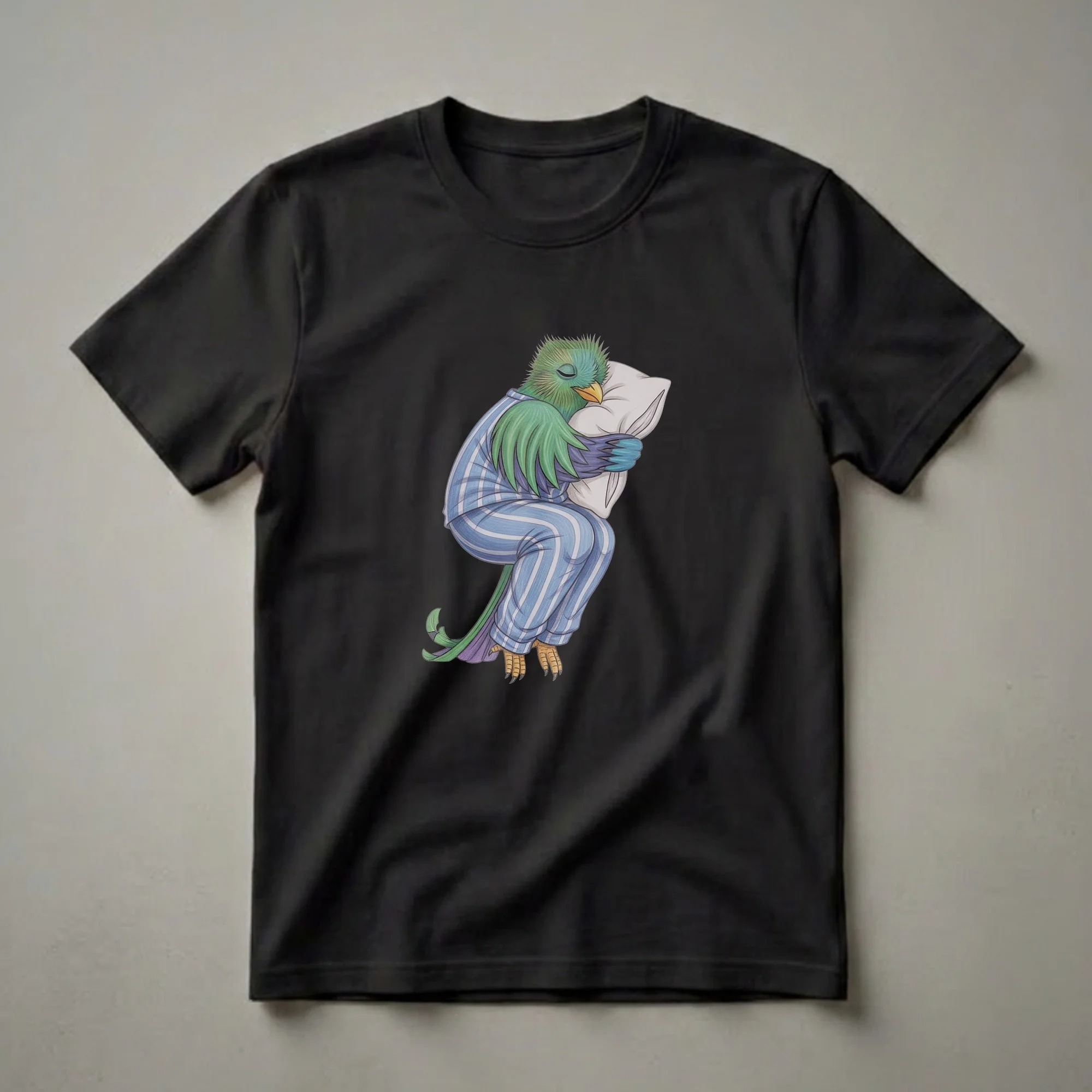 Quetzal owners and bird enthusiasts will appreciate this whimsical graphic tee. The striking artwork depicts a Resplendent Quetzal, known for its vibrant green and blue plumage, dressed in blue and white striped pajamas. This unique bird is curled up, fast asleep and clutching a soft pillow, embodying the ultimate cozy moment. The Resplendent Quetzal is native to Central America, often found in humid cloud forests, and is considered one of the most beautiful birds in the world. This shirt captures a humorous and relatable scene, a thoughtful choice for anyone who loves birds or enjoys a good night's sleep. It makes a thoughtful gift for the bird watcher in your life or for someone who simply loves to nap. Wear this comfortable tee to your next casual gathering, game night, or simply while enjoying a lazy morning. This t-shirt is a conversation starter and a delightful addition to any wardrobe, celebrating the beauty of nature with a touch of humor.