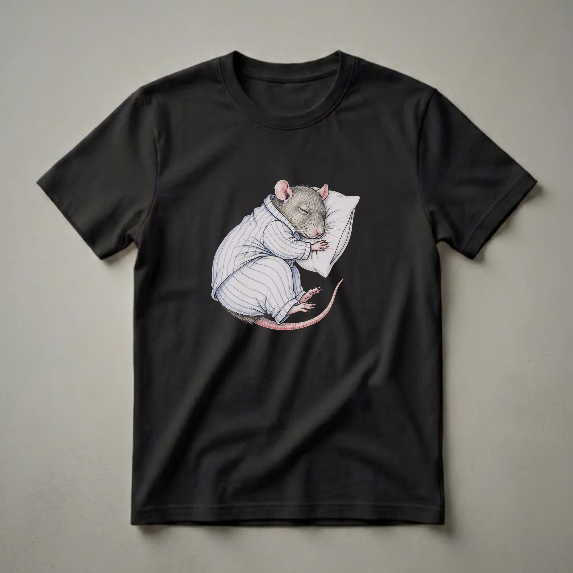 For anyone who appreciates the humor in everyday life, this graphic tee showcases a charming illustration of a rat embracing a deep slumber. The artwork depicts a small rodent, meticulously drawn with soft fur textures, nestled comfortably on a plush pillow. It's dressed in classic blue and white striped pajamas, complete with a button-up top and matching bottoms, highlighting the whimsical concept of an animal enjoying a peaceful night's sleep. Rats, often misunderstood, are known for their intelligence and social behaviors, and this design playfully reimagines one in a relatable, cozy scene. This t-shirt is a thoughtful gift for friends who love animals, especially those who enjoy a good laugh or a cozy night in. It's a unique piece of apparel that sparks conversation and brings a smile to anyone's face. Wear this tee to casual gatherings, game nights, or simply when you want to express your appreciation for humor and comfort. It’s a go-to tee for anyone who understands the universal appeal of a long, uninterrupted nap. This shirt is a fun way to show off your sense of humor and your love for all creatures, big or small, especially when they're catching some Z's.
