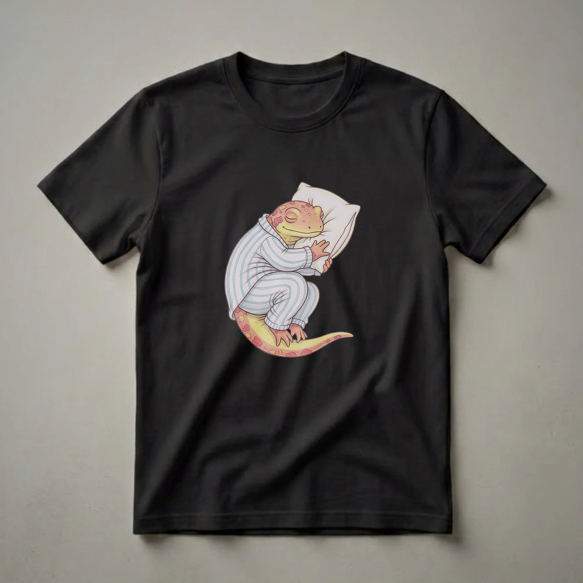 Salamanders, known for their amphibian nature and often vibrant skin patterns, are depicted here in a whimsical, slumbering pose. This eye-catching graphic tee showcases a charming salamander, complete with orange and red spots, curled up and fast asleep on a fluffy white pillow. It's dressed in classic blue and white striped pajamas, complete with a matching pajama top and bottoms, highlighting a humorous and relatable scene of ultimate relaxation. This t-shirt is a thoughtful gift for anyone who appreciates the humor in animal antics or identifies with the desire for a peaceful nap. It's a go-to tee for lazy weekend mornings, casual game nights, or simply lounging around the house. The drawing style has a soft, colored-pencil aesthetic, giving it a unique and artistic feel. This shirt is for those who love unique animal art and find joy in the simple pleasure of a good night's sleep, or perhaps a good day's nap. It's a fun way to express a love for all things cozy and cute, making it a staple in any casual wardrobe.