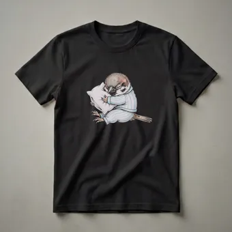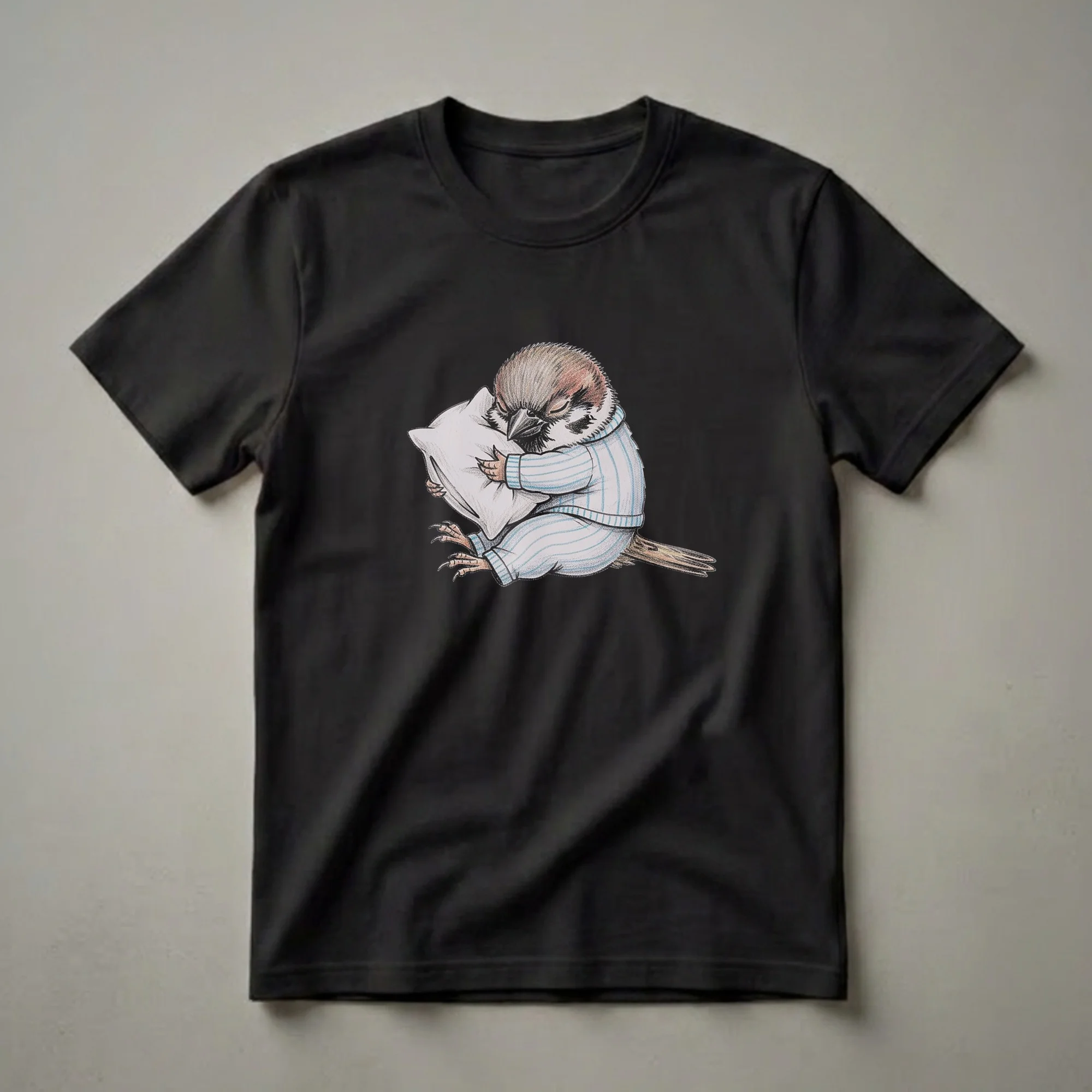 Sparrow owners and bird enthusiasts who appreciate a good night's sleep will reach for this unique graphic tee. The artwork showcases a charming sparrow, meticulously drawn with colored pencils, dressed in blue-striped pajamas and tightly hugging a fluffy white pillow. Its eyes are closed, conveying a deep sense of slumber and comfort. Sparrows, known for their adaptability and presence in urban environments, are often seen flitting about during the day, making this depiction of one enjoying a peaceful rest a humorous contrast. This t-shirt is a thoughtful gift for anyone who loves birds, enjoys cozy sleepwear, or simply relates to the feeling of wanting to curl up with a pillow. It's a conversation starter, a thoughtful choice for casual outings, game nights, or just lounging around the house. Imagine wearing this to a relaxed brunch or a quiet evening in; it’s a wearable piece of art that celebrates the simple joys of rest and the charm of these common backyard birds. This shirt is a staple in the collection for those who find humor in everyday moments and appreciate whimsical animal art.