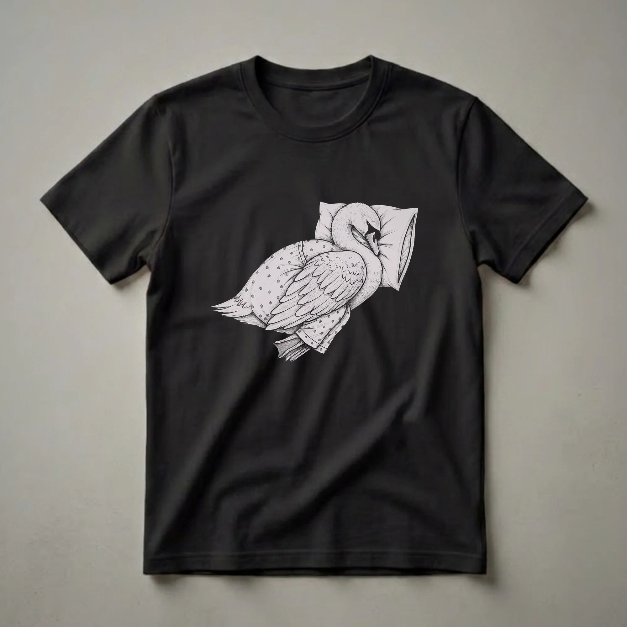 Swans, known for their grace and elegance in the water, are depicted here in a whimsical, slumbering pose. This eye-catching graphic tee showcases a detailed pencil-style drawing of a swan nestled comfortably on a pillow, complete with a cozy set of polka dot pajamas. The artwork captures a moment of pure relaxation, transforming the majestic bird into a relatable figure for anyone who appreciates a good night's sleep. This shirt is a thoughtful gift for friends or family members who love animals, especially those who enjoy a touch of humor and a good laugh. It's a staple in the collection for anyone who identifies with the desire to curl up and rest. The intricate linework of the drawing highlights the texture of the feathers and the soft folds of the pajamas, making it a visually appealing piece of apparel. This t-shirt works well for casual outings, lounging at home, or attending a relaxed game night. It's a conversation starter that brings a smile to faces, celebrating the lighter side of life and the universal comfort of sleep. Imagine gifting this to your sister who always says she needs more sleep or to a friend who adores swans and their serene presence.