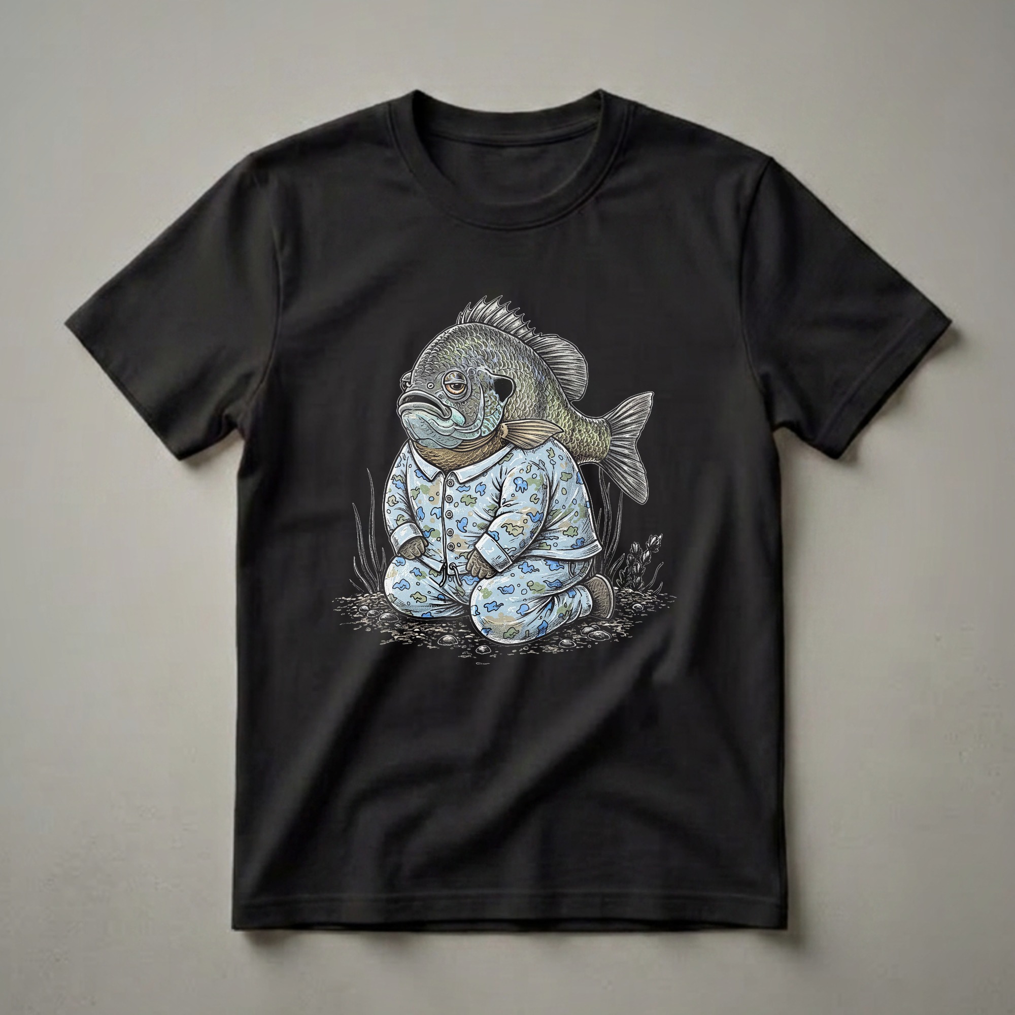 Anglers who appreciate a good laugh will reach for this unique bluegill fish t-shirt. The graphic showcases a bluegill, a common freshwater fish known for its distinctive circular body and vibrant colors, depicted in a humorous, anthropomorphic style. This particular bluegill is shown wearing a light blue pajama set adorned with a playful pattern of clouds and camouflage shapes, complete with buttons and drawstring. It sits in a relaxed, almost weary pose on a dark, rocky riverbed, surrounded by sparse aquatic vegetation, with its large, expressive eyes conveying a sense of profound sleepiness. Bluegill, scientifically known as Lepomis macrochirus, are found throughout North America and are a popular target for recreational fishing due to their abundance and willingness to bite. This tee is a thoughtful gift for any fisherman who understands the feeling of wanting to stay in bed rather than get up early for a fishing trip, or for anyone who simply enjoys quirky, nature-inspired humor. It's a comfortable shirt to wear on casual outings, to fishing club meetings, or simply while relaxing at home, dreaming of the next catch. This eye-catching design captures the essence of a lazy morning, making it a staple for any angler's wardrobe.