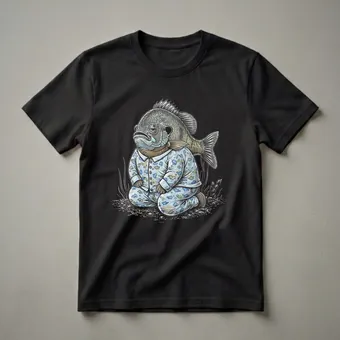 - This bluegill t-shirt features a humorous, sleepy fish character dressed in pajamas.