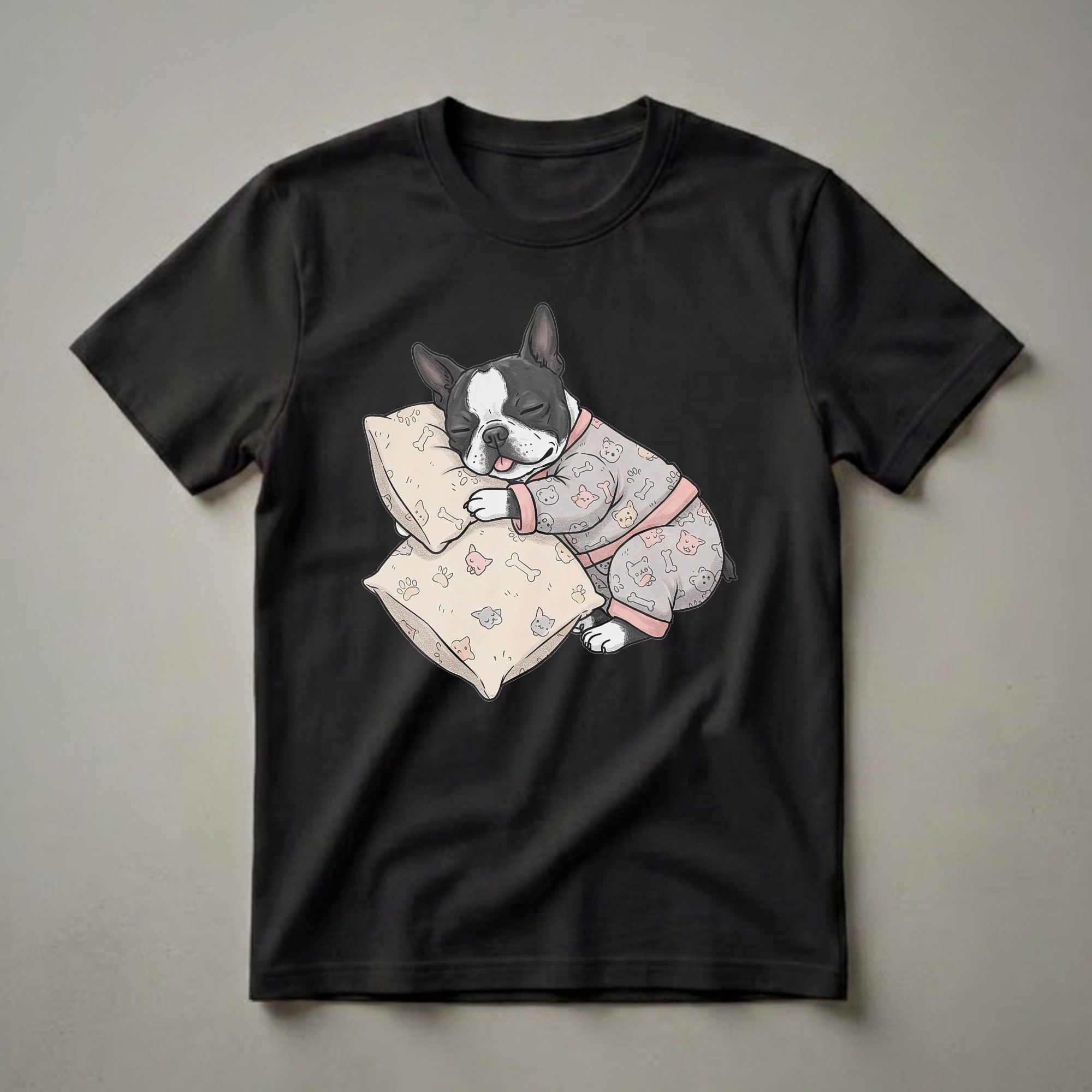 Boston Terrier owners who appreciate a good night's sleep will adore this charming graphic tee. The design showcases a black and white Boston Terrier, complete with its signature tuxedo markings, sound asleep on a pair of plush pillows. The dog is depicted wearing adorable grey pajamas adorned with a playful pattern of cartoon cats, bones, and paw prints, accented with soft pink trim. This eye-catching t-shirt captures the essence of cozy relaxation and the deep bond between humans and their canine companions. Boston Terriers, known for their affectionate nature and compact size, make wonderful pets for various living situations, from apartments to houses. This shirt is a thoughtful gift for any Boston Terrier mom or dad, or for anyone who simply loves dogs and enjoys a humorous, comfortable piece of apparel. It's a go-to tee for lounging at home, enjoying a lazy weekend morning, or even as sleepwear. Imagine wearing this to a casual get-together or simply relaxing on the couch with your own furry friend.