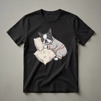 - This graphic tee features a Boston Terrier in a peaceful slumber, designed for dog lovers who value relaxation.