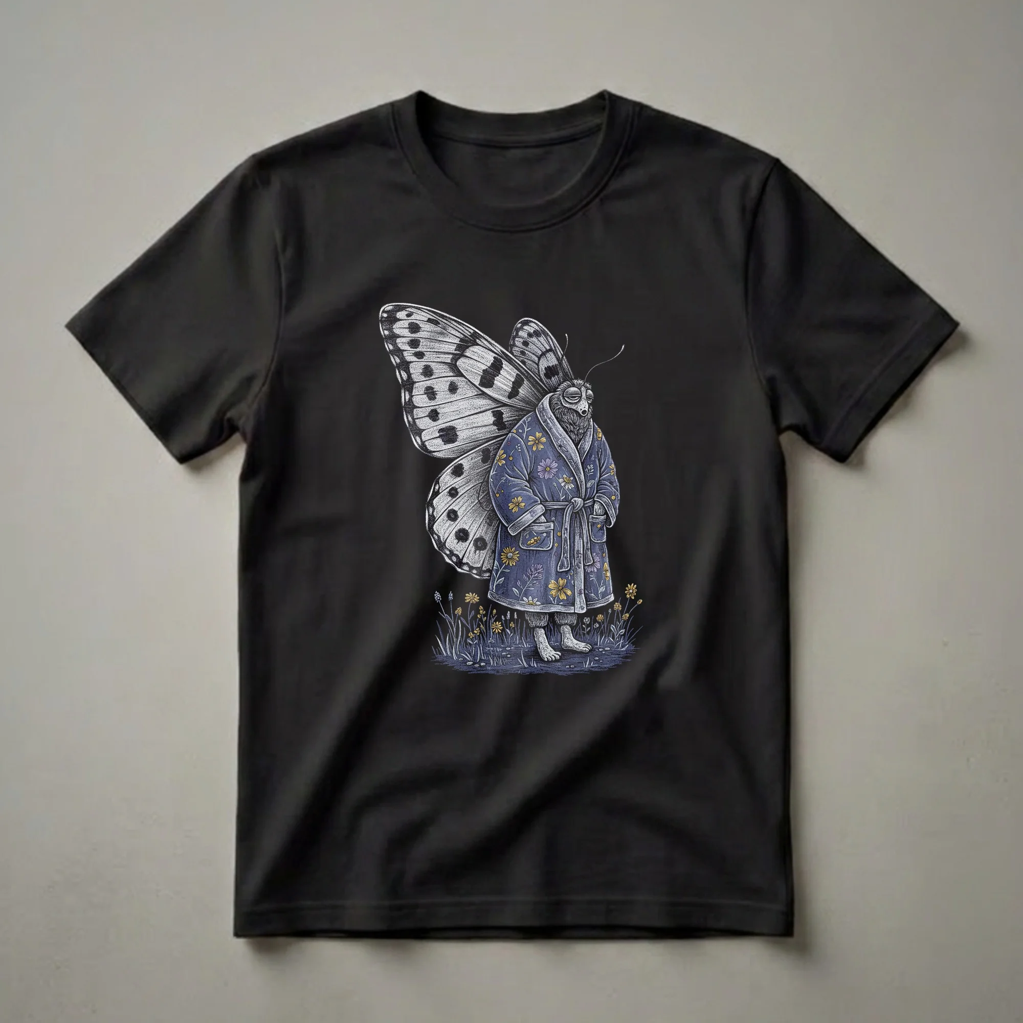 - Features a detailed depiction of a sleepy butterfly wearing a floral robe.