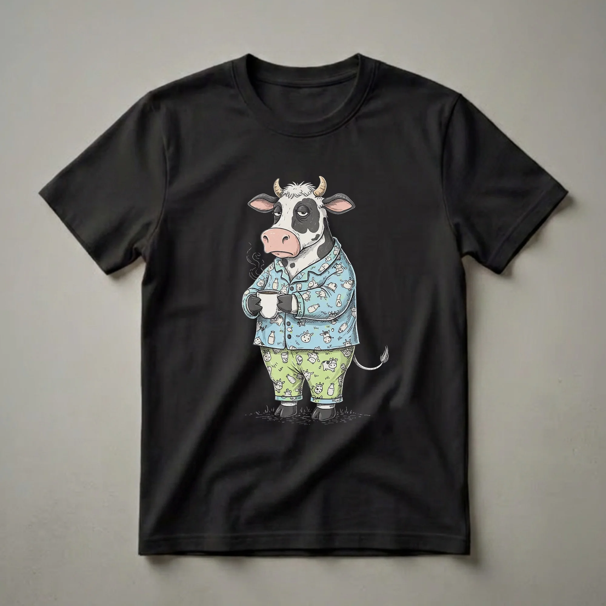 Coffee lovers who appreciate a good laugh will reach for this graphic tee. The design showcases a black and white cow, complete with horns and a distinctly tired expression, dressed in light blue pajamas adorned with milk bottles and smaller cow illustrations. This bovine character clutches a steaming mug of coffee, its weary eyes and slumped posture perfectly capturing the feeling of needing that morning caffeine boost. The pajama bottoms are a cheerful green, patterned with more playful cows and milk jugs, adding a whimsical touch to the sleepy theme. Cows, known for their gentle nature and their vital role in dairy production, are humorously depicted here as needing their own morning pick-me-up. This shirt works well for anyone who understands the struggle of waking up before the coffee kicks in, whether they work in the food industry, are early risers, or simply enjoy a cozy pajama aesthetic. It makes a thoughtful gift for friends or family members who are devoted coffee drinkers or have a soft spot for farm animals. Wear this tee on lazy weekend mornings, during your coffee break, or as comfortable sleepwear.