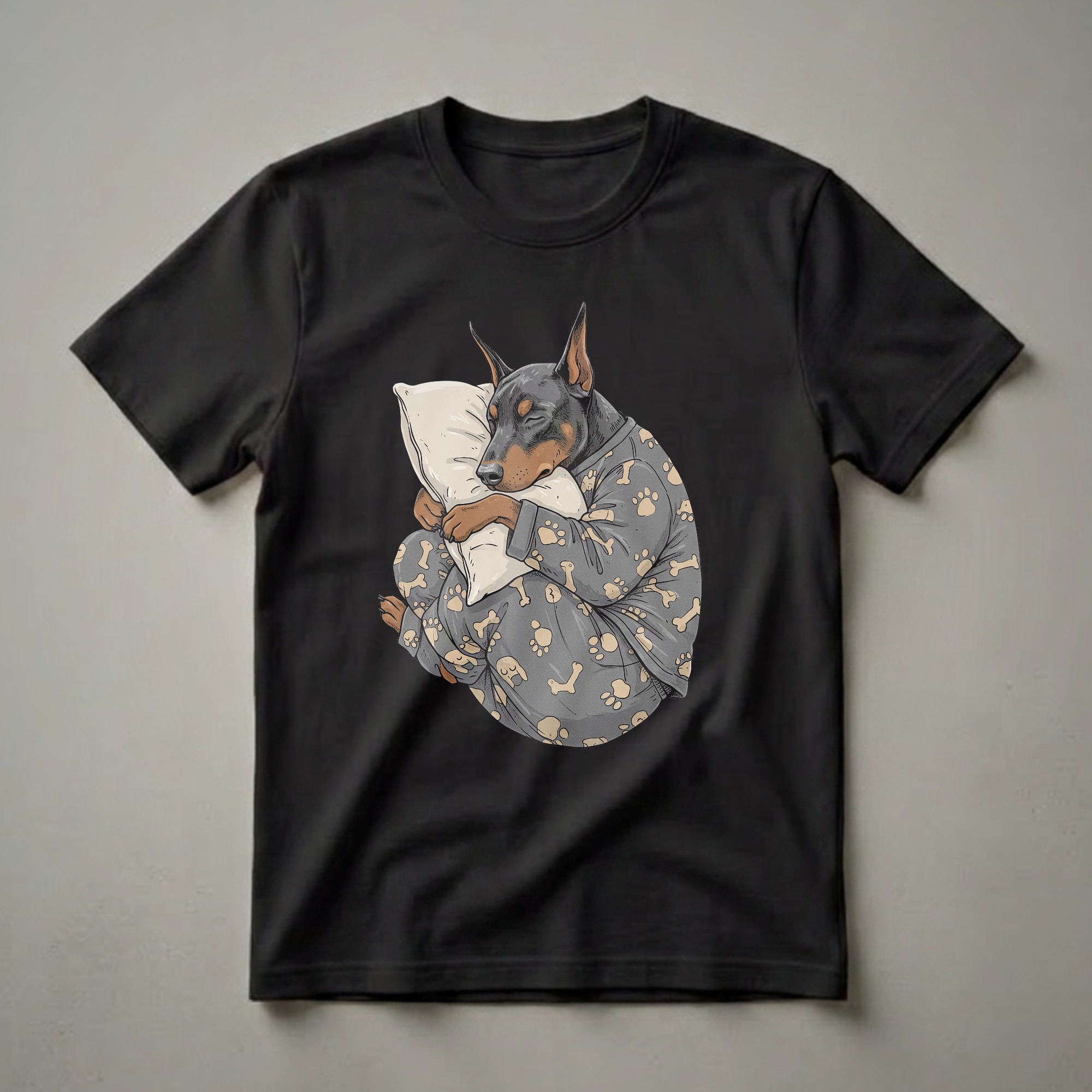 Doberman Pinscher owners know their loyal companions can be both protective and incredibly cuddly, especially when it's time to rest. This eye-catching graphic tee showcases a Doberman Pinscher dog embracing a pillow, dressed in cozy pajamas adorned with paw prints and bones. The illustration captures the serene moment of sleep, highlighting the breed's distinctive features while presenting a humorous and endearing scene. Dobermans, originally bred in Germany, are known for their intelligence and athleticism, but this design focuses on their softer, sleepy side. This comfortable shirt is a thoughtful gift for any Doberman mom or dad who appreciates a good night's sleep and loves their dog dearly. It's a staple in the collection for anyone who wants to wear their affection for their canine friend. Imagine wearing this tee while relaxing at home or enjoying a casual weekend brunch, sparking conversations with fellow dog enthusiasts. This t-shirt is a delightful way to express your love for Dobermans and embrace the cozy vibes of downtime.