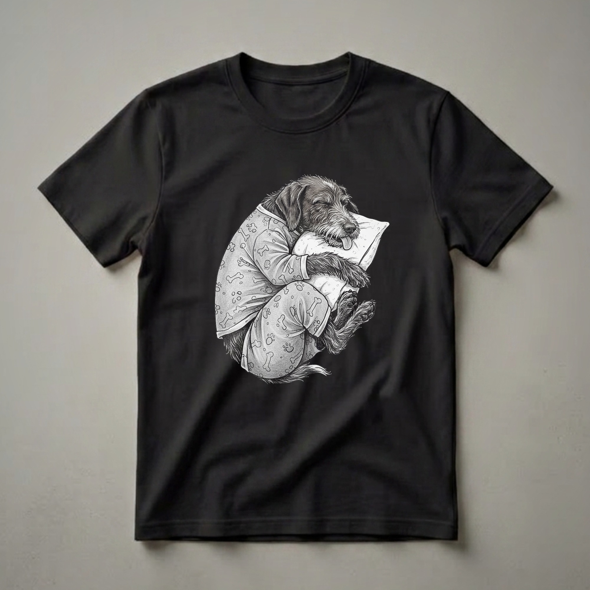 German Wirehaired Pointer owners know the breed's energetic nature, but this graphic tee captures a moment of pure relaxation. The detailed pencil sketch style illustration showcases a German Wirehaired Pointer dog curled up and fast asleep on a plush pillow. The dog is depicted wearing cozy pajamas adorned with a playful pattern of bones and paw prints, complete with its tongue playfully peeking out. This eye-catching design is a testament to the deep bond between owners and their canine companions, highlighting the joy of seeing your dog at peace. This comfortable shirt is a thoughtful gift for any German Wirehaired Pointer mom or dad who cherishes their dog's downtime. It's a staple in the collection for anyone who appreciates canine comfort and a good night's sleep. Wear this tee to relax at home, during your morning coffee, or to a casual get-together with fellow dog enthusiasts. The German Wirehaired Pointer, known for its versatility as a hunting dog and loyal companion, is beautifully represented in this artistic depiction of slumber. This shirt is a wonderful way to express your love for this distinctive breed.