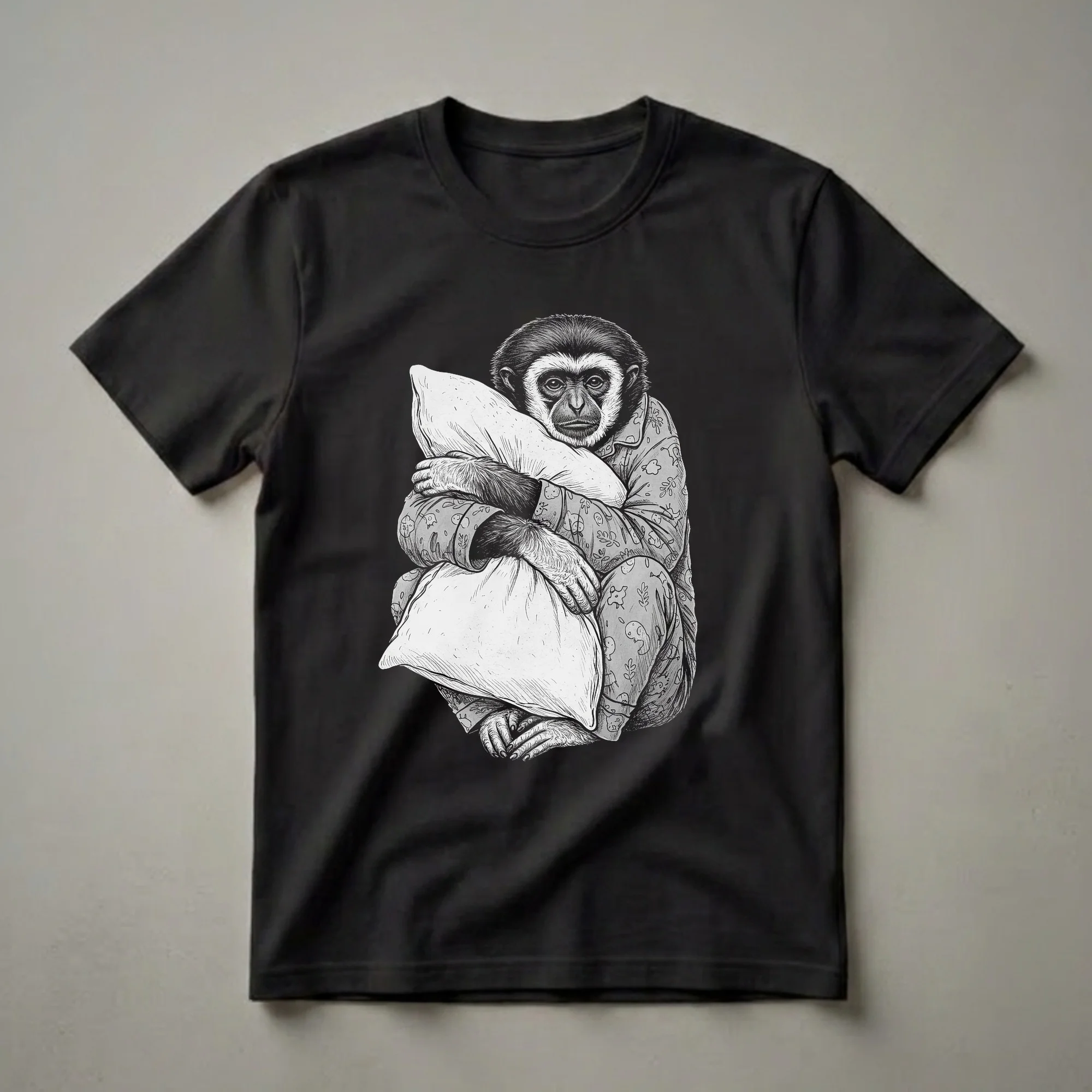Gibbons, known for their arboreal lifestyle and long arms, are depicted here in a moment of profound slumber. This t-shirt shows a gibbon, clad in a whimsical pattern of pajamas featuring birds and leaves, clutching a large pillow with both hands. The detailed sketch captures the gibbon's tired expression, making it a relatable image for anyone who cherishes a good night's sleep. Gibbons are one of the prime examples of brachiation, using their arms to swing from tree to tree, but this particular gibbon seems content to stay grounded for a restful nap. The black and white illustration style gives this graphic tee a timeless appeal. This shirt is a go-to tee for those who appreciate a touch of humor and a love for all things slumber. It makes a thoughtful gift for men, women, or children who understand the joy of a relaxed morning or a cozy evening. Whether lounging around the house or heading to bed, this unique pajama shirt offers a playful way to express your inner sleepyhead. This comfortable tee is a staple in the collection for anyone who feels a connection to the gentle, sleepy nature of primates.