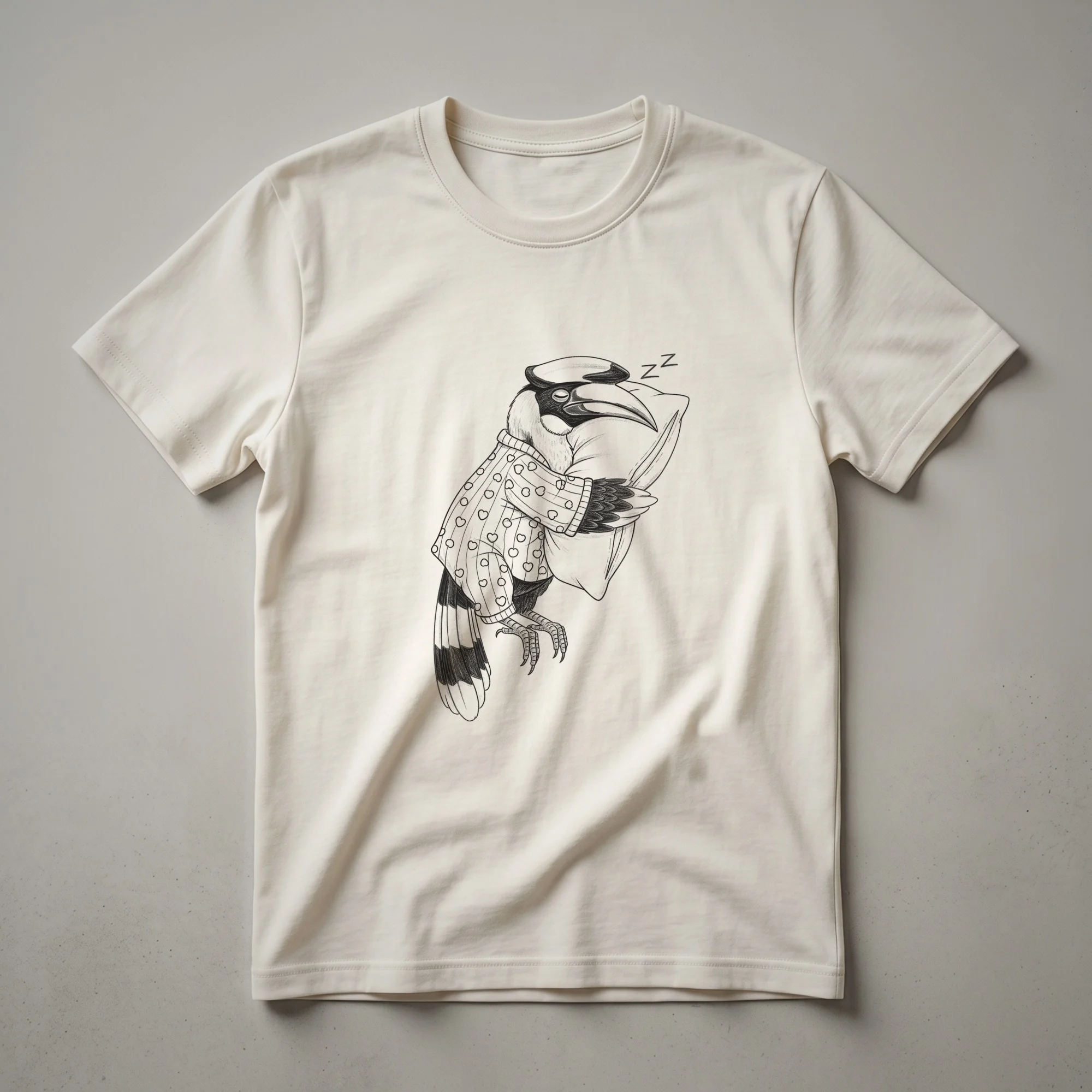 For those who appreciate the humor in a slumbering bird, this graphic tee showcases a charming drawing of a hornbill dressed in cozy pajamas. The artwork captures the essence of a peaceful, sleepy creature, making it a delightful addition to any casual wardrobe. Hornbills are known for their distinctive large, colorful bills, which are often brightly colored and can be quite striking. These birds are found in tropical and subtropical Africa and Asia, where they inhabit forests and savannas. This t-shirt is a thoughtful gift for bird enthusiasts, animal lovers, or anyone who enjoys a touch of whimsy in their clothing. It’s a go-to tee for lounging at home, attending casual gatherings, or simply expressing a love for unique animal art. The drawing style is artistic and eye-catching, ensuring that this shirt stands out. Imagine wearing this to a relaxed brunch or a game night with friends; it’s sure to spark conversations and bring smiles. This comfortable shirt is a fun way to showcase your appreciation for the avian world and your sense of humor.