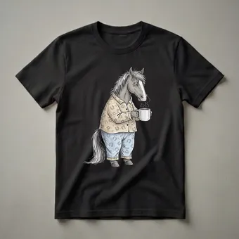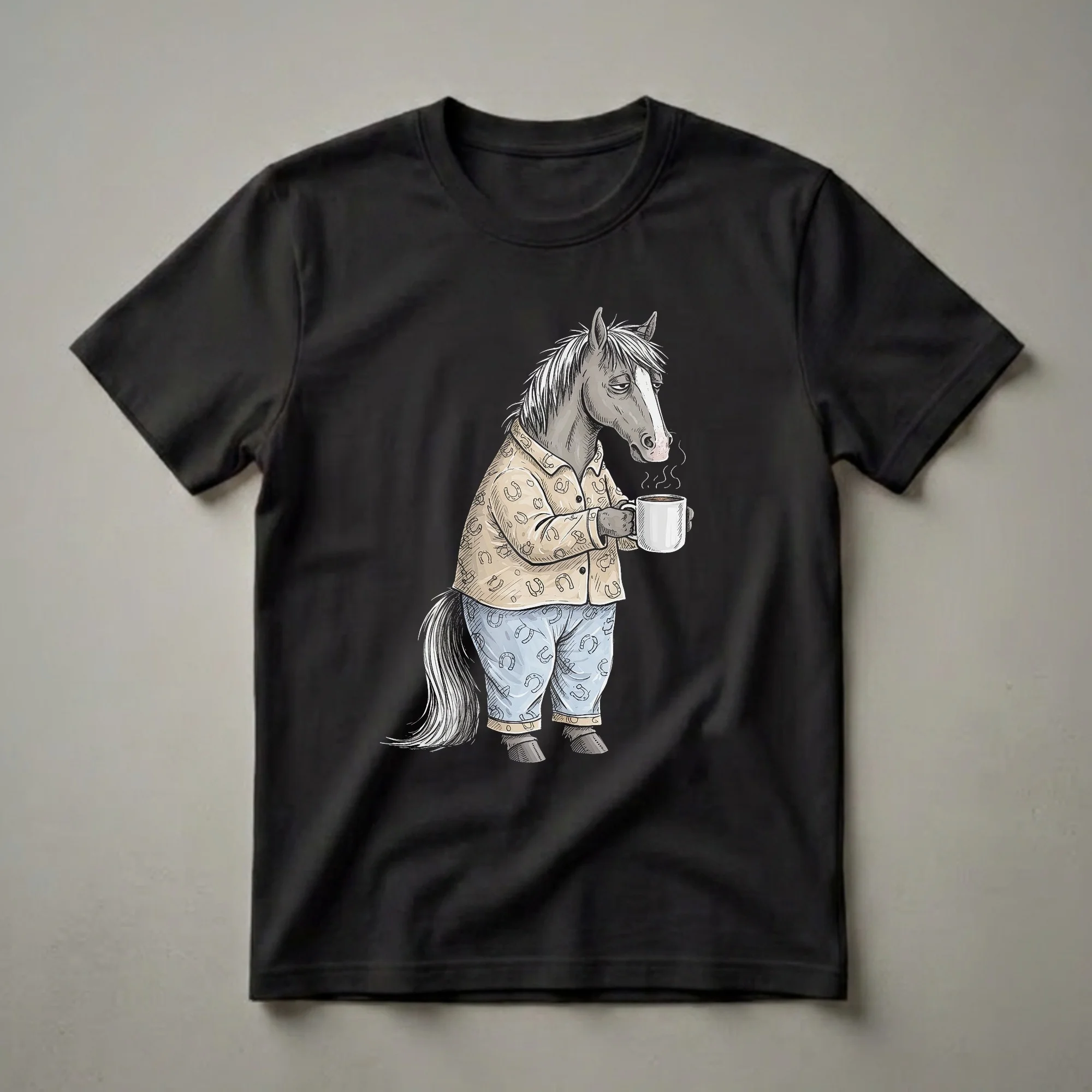 Horse owners and coffee aficionados alike will appreciate this humorous graphic tee. The design features a cartoon horse, depicted with droopy eyes and a weary expression, clad in a pair of pajamas. The top is adorned with a pattern of horseshoes, while the bottoms showcase a similar horseshoe motif. In its hands, the horse clutches a steaming mug of coffee, a clear indicator of its morning struggle. This visual perfectly captures the sentiment of anyone who needs that first cup of coffee to face the day. Horses, known for their powerful build and energetic nature, are often associated with early mornings and demanding routines, making this juxtaposition with a sleepy demeanor particularly amusing. This t-shirt is a thoughtful gift for the horse mom or dad who also happens to be a dedicated coffee drinker. It's a staple in the collection for anyone who loves a good laugh and a warm beverage to start their day. Wear this tee to your next casual brunch or simply lounge around the house in comfort.