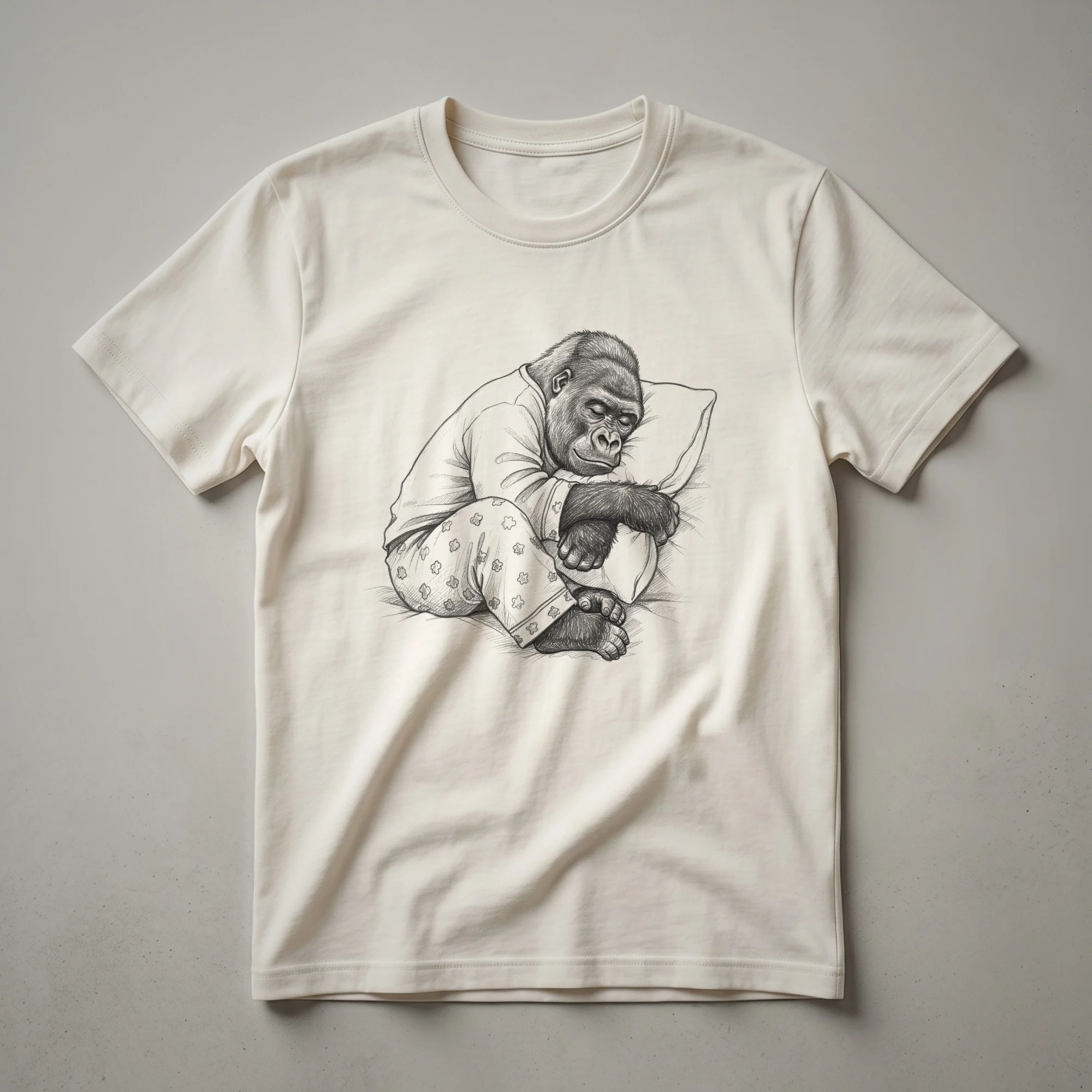 Gorilla owners and fans of primate humor will appreciate this unique graphic tee. The design showcases a charming, stylized drawing of a gorilla comfortably asleep, adorned in pajamas. Gorillas, known for their intelligence and social structures, are fascinating creatures that inhabit the forests of Africa. This t-shirt captures a whimsical, relaxed side of these powerful animals, presenting them in a relatable, sleepy state. It's a playful piece of apparel that speaks to anyone who enjoys a good laugh and appreciates animal-themed art. This shirt works well for casual outings, game nights, or simply lounging around the house. It makes a thoughtful gift for friends or family members who have a soft spot for gorillas or simply love a funny, eye-catching design. Embrace your inner primate and showcase your love for a good snooze with this comfortable and conversation-starting t-shirt. It’s a staple in any collection of humorous animal apparel. This sleepy gorilla tee is sure to bring smiles.
