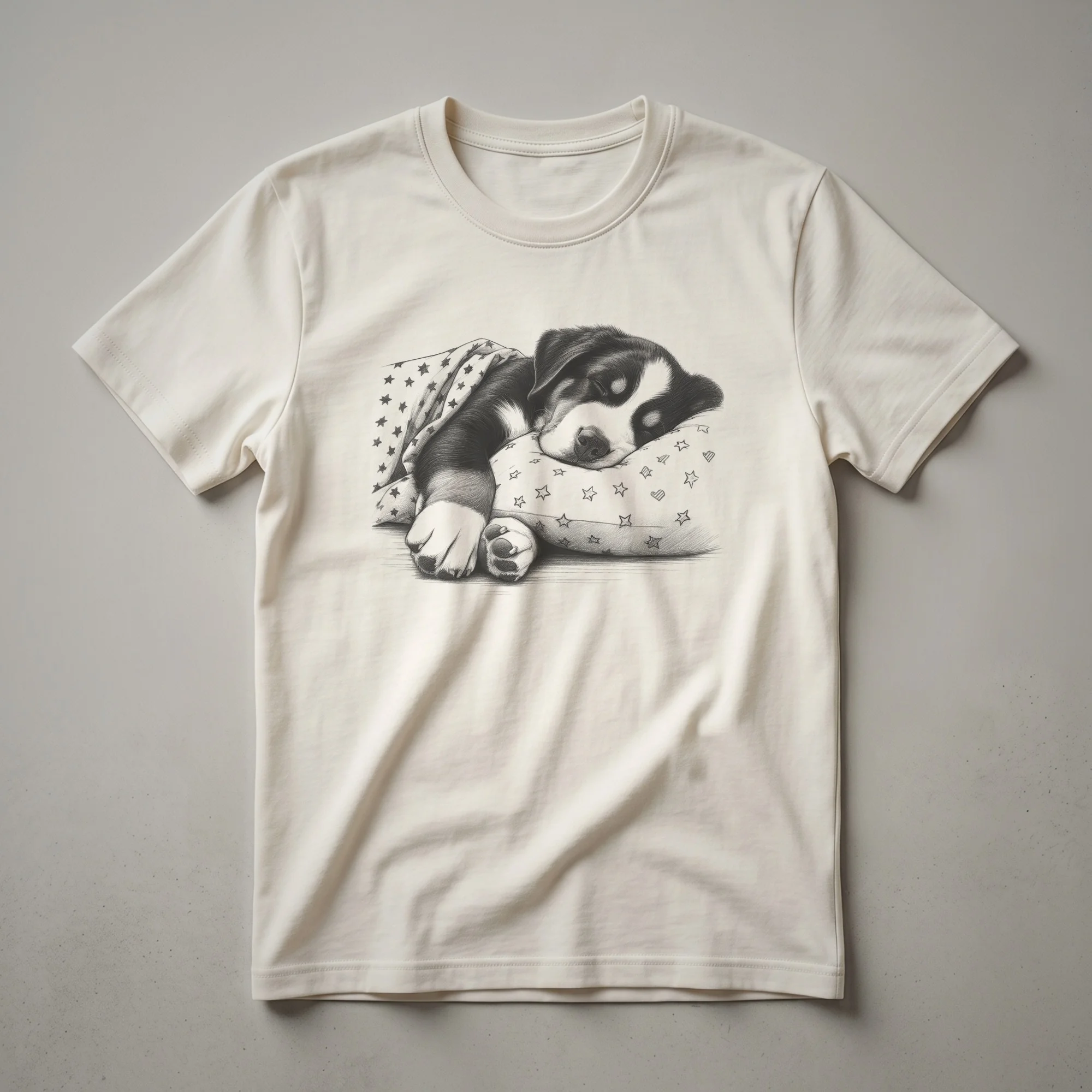 - This Greater Swiss Mountain Dog t-shirt showcases a charming, artistic rendering of a dog in its cozy pajamas, ready for sleep.