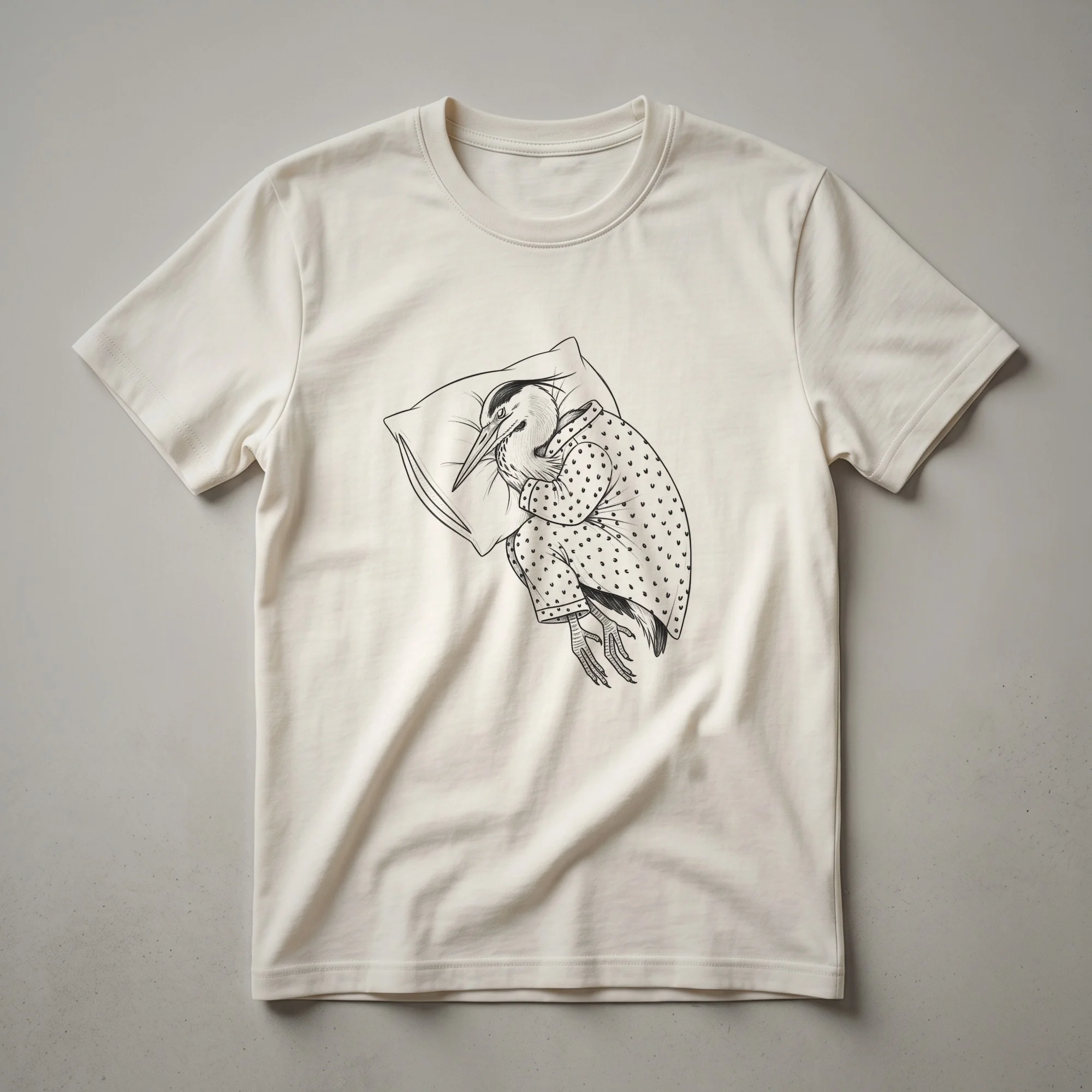 Bird watchers and fans of avian humor will appreciate this unique graphic tee. The design showcases a minimalist line drawing of a heron, depicted wearing cozy pajamas. Herons, known for their graceful yet often still presence in wetlands, are captured here in a moment of ultimate relaxation. These wading birds are often seen standing motionless for extended periods, making this sleepy heron design a fitting representation of their patient nature, albeit with a humorous pajama twist. This t-shirt works well for anyone who enjoys a good laugh and has an affinity for feathered friends. It’s a staple in the collection for those who appreciate quirky animal art and the simple joy of a comfortable pajama set. This shirt makes a thoughtful gift for the bird enthusiast in your life who also enjoys a good night's sleep or a lazy weekend morning. Wear this tee to your next casual outing, bird-watching trip, or simply while lounging at home. It’s a conversation starter that celebrates both nature and the universal love for comfort. The simple, clean lines of the drawing make this a versatile piece for any wardrobe, appealing to those who prefer understated yet witty designs.