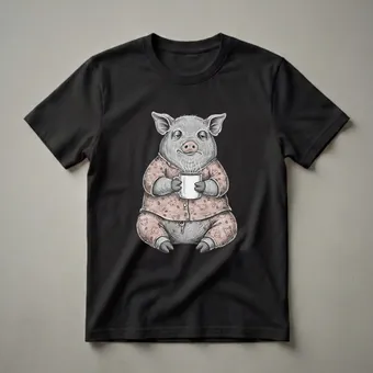 Coffee lovers who appreciate a good laugh will reach for this graphic tee featuring a charmingly tired pig. The illustration depicts a pig dressed in a pink pajama set adorned with playful pig faces and coffee beans. This sleepy swine is holding a white mug from which steam gently rises, symbolizing the much-needed warmth and energy that coffee provides. Pigs, known for their intelligence and surprisingly complex social behaviors, often enjoy simple pleasures, much like a warm cup of coffee to start the day. This t-shirt captures that relatable feeling of needing a caffeine kick to face the morning. It's a thoughtful gift for any coffee aficionado, especially those who identify with the struggle of waking up before their first brew. Wear this comfortable tee to your favorite coffee shop, during lazy weekend mornings, or while lounging at home. It’s a staple in the collection for anyone who understands that coffee is essential for functioning before noon. This shirt is a humorous nod to the daily ritual of coffee consumption and the universal desire for a peaceful, albeit sleepy, start to the day.