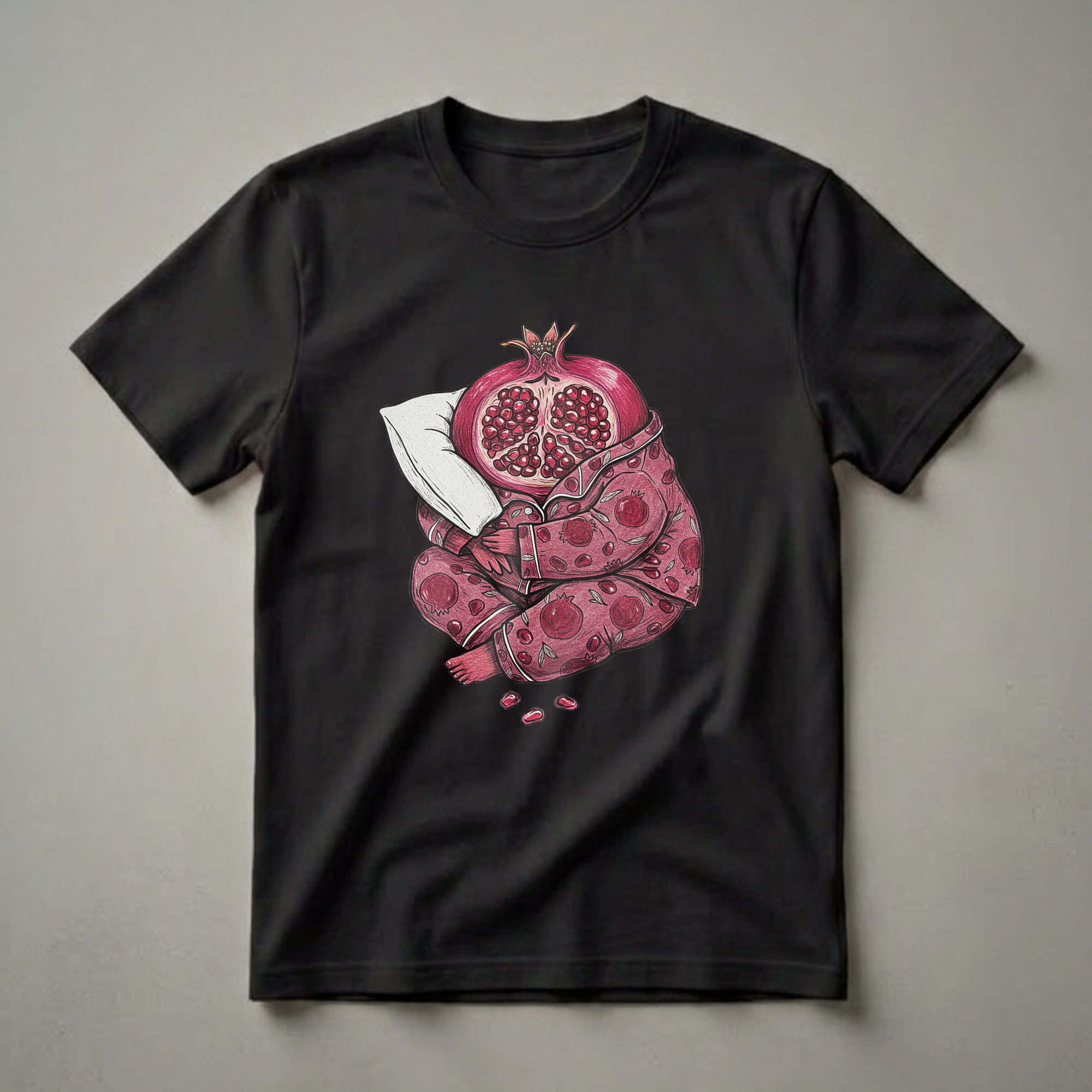 Pomegranates, known for their vibrant color and jewel-like seeds, are often associated with abundance and fertility. This particular pomegranate, however, seems more interested in rest. It's depicted in a charming, hand-drawn style, wearing a cozy pajama set adorned with a repeating pattern of smaller pomegranates and delicate leaves. The fruit is curled up, resting its head on a white pillow, with a few loose arils scattered nearby, suggesting a peaceful slumber. This graphic tee is a playful nod to the simple joys of relaxation and a unique way for fruit enthusiasts to express their love for this fascinating produce. It's a thoughtful gift for anyone who appreciates a good night's sleep or simply enjoys whimsical food-themed apparel. This t-shirt works well for casual wear, lounging at home, or as a conversation starter at your next brunch gathering. Imagine wearing this to a farmers market or a casual get-together, sparking smiles with its unique design.
