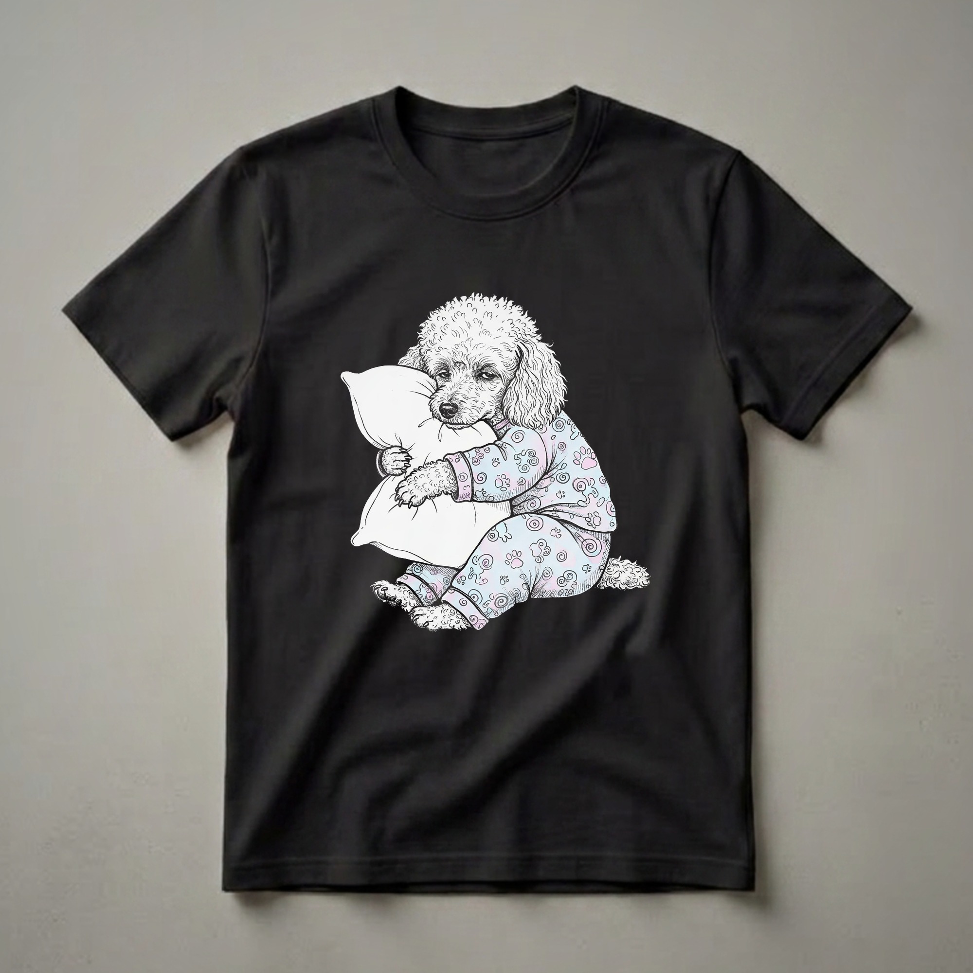Poodle owners who appreciate a good night's sleep will adore this charming graphic tee. The artwork features a detailed black and white illustration of a poodle, complete with its signature curly fur, dressed in a whimsical pajama set. The pajamas are adorned with a playful pattern of paw prints and swirls, rendered in soft pastel hues of blue and pink, suggesting comfort and coziness. The poodle is depicted sitting and hugging a large pillow, its eyes conveying a sleepy, content expression. Poodles, known for their intelligence and elegant appearance, are often seen as companion animals, and this design captures a relatable moment of relaxation. This t-shirt works well for anyone who loves dogs, especially those who own or admire poodles. It makes a thoughtful gift for birthdays, holidays, or just because for the dog mom or dad in your life. Wear this comfortable shirt while lounging at home, enjoying a lazy weekend morning, or even to a casual pajama party. It’s a delightful way to showcase your affection for your furry friend and embrace a relaxed lifestyle. This pajama dog shirt is a staple in any dog lover's casual wardrobe.