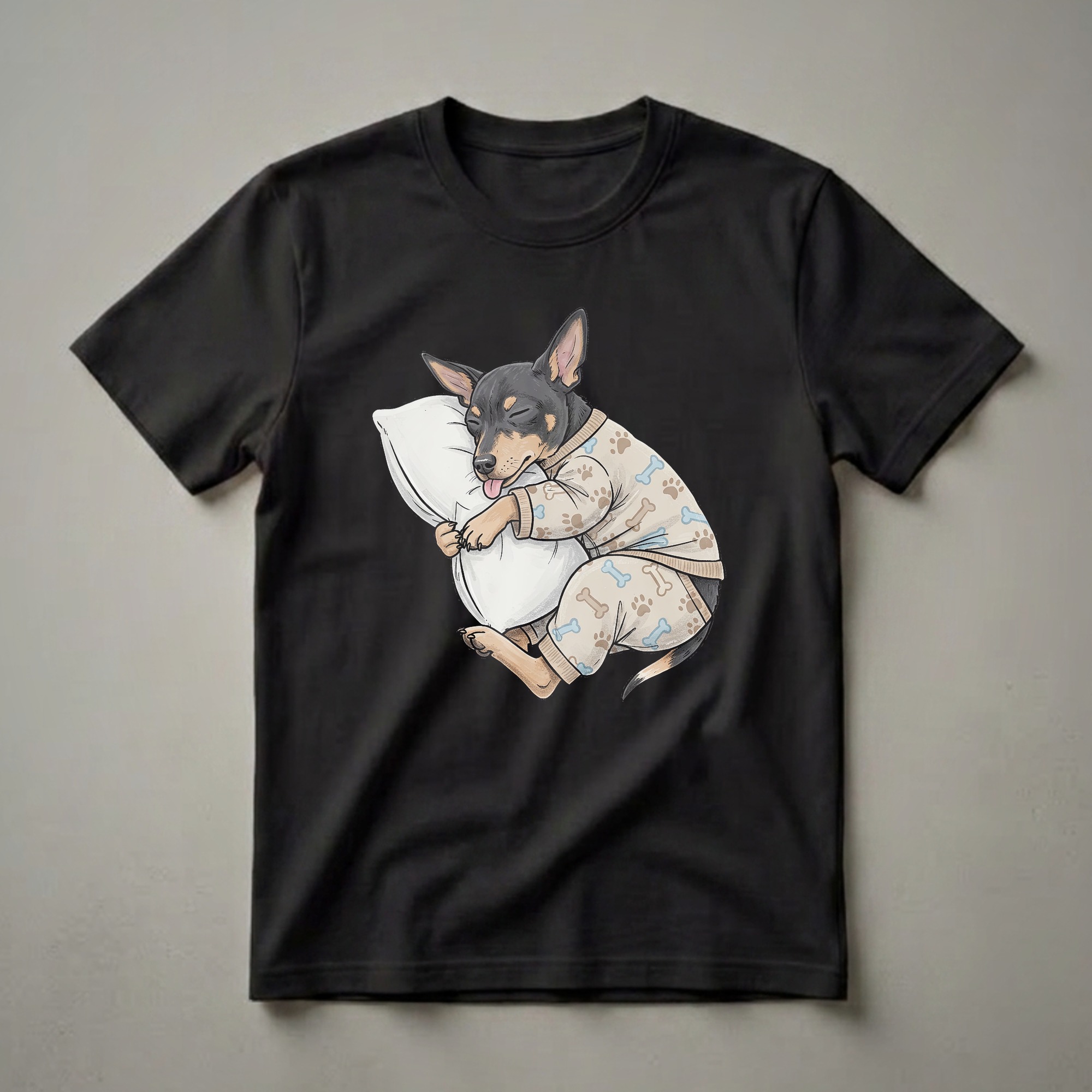 Rat Terrier owners know the joy of a sleepy pup curled up after a long day of play. This eye-catching graphic tee captures that exact moment, showcasing a charming illustration of a Rat Terrier dog dressed in cozy pajamas. The pajamas are adorned with a playful pattern of paw prints and dog bones in shades of tan and blue, adding a whimsical touch. The dog is depicted with its eyes closed, a tiny tongue peeking out, and its paws wrapped around a soft white pillow, embodying ultimate relaxation. Rat Terriers are known for their energetic and alert nature, making this depiction of peaceful slumber even more endearing. This comfortable shirt is a thoughtful gift for any woman or man who cherishes their Rat Terrier or any dog lover who appreciates a good night's sleep. It's a staple in the collection for anyone who loves to relax and unwind, perhaps while watching their own canine companion do the same. Wear this tee to casual outings, lounging at home, or even to a pajama party to share your love for these spirited little dogs.