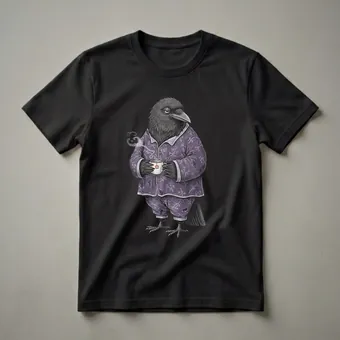 Tea lovers who appreciate a bit of humor will reach for this eye-catching graphic tee. The design showcases a raven, a bird known for its intelligence and adaptability, depicted in a charmingly sleepy state. This corvid is dressed in a purple pajama set adorned with a delicate white floral and bird pattern, complete with a matching piping trim. It clutches a steaming mug of tea, with wisps of steam curling upwards, suggesting a cozy morning or a late-night indulgence. Ravens are found across the Northern Hemisphere, often associated with folklore and mythology, adding a layer of intrigue to this whimsical portrayal. This t-shirt makes a thoughtful gift for anyone who enjoys a warm beverage and a good laugh, especially those who identify with the quiet contemplation of a bird enjoying its morning brew. It's a staple in the collection for those who love unique animal art and a touch of pajama-clad charm. Wear this tee to your next brunch or while enjoying a quiet moment with your favorite hot drink.