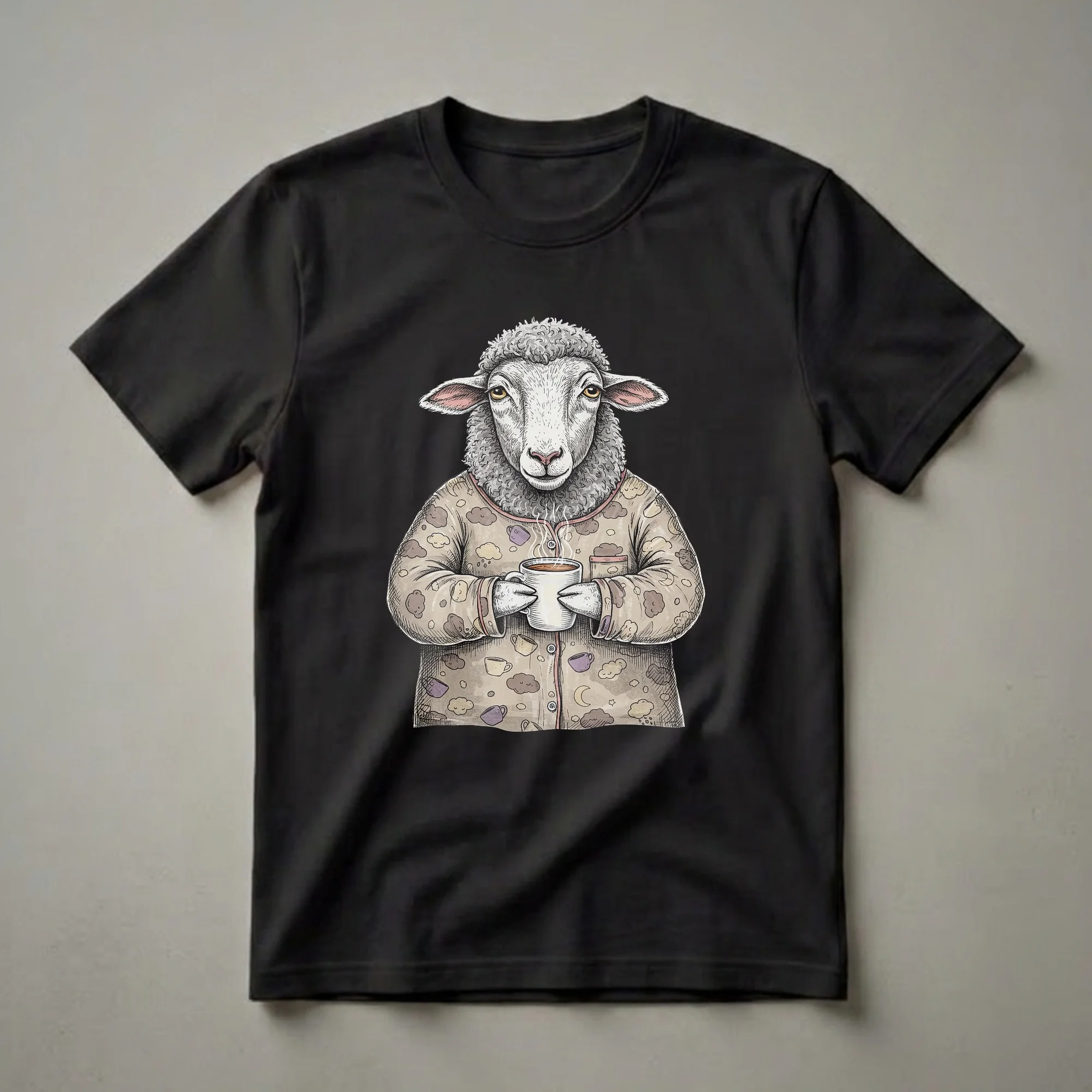 Sheep, known for their gentle nature and woolly coats, are often associated with counting to fall asleep. However, this graphic tee celebrates a different side of these farm animals: the need for a morning caffeine boost. The illustration depicts a sheep dressed in pajamas adorned with clouds, moons, and coffee cups, holding a steaming mug of coffee. This eye-catching design captures the relatable feeling of needing that first cup to start the day, even for our ovine friends. This t-shirt is a staple for anyone who identifies with the struggle of waking up before their coffee kicks in. It's a thoughtful gift for coffee lovers, farmers, or anyone who appreciates a touch of whimsical humor in their wardrobe. Wear this shirt to your next brunch or casual gathering and let your love for coffee and farm animals shine. The vintage illustration style adds a unique charm, making it a standout piece for your collection. This tee works well for those who enjoy a relaxed morning routine and a good cup of joe.