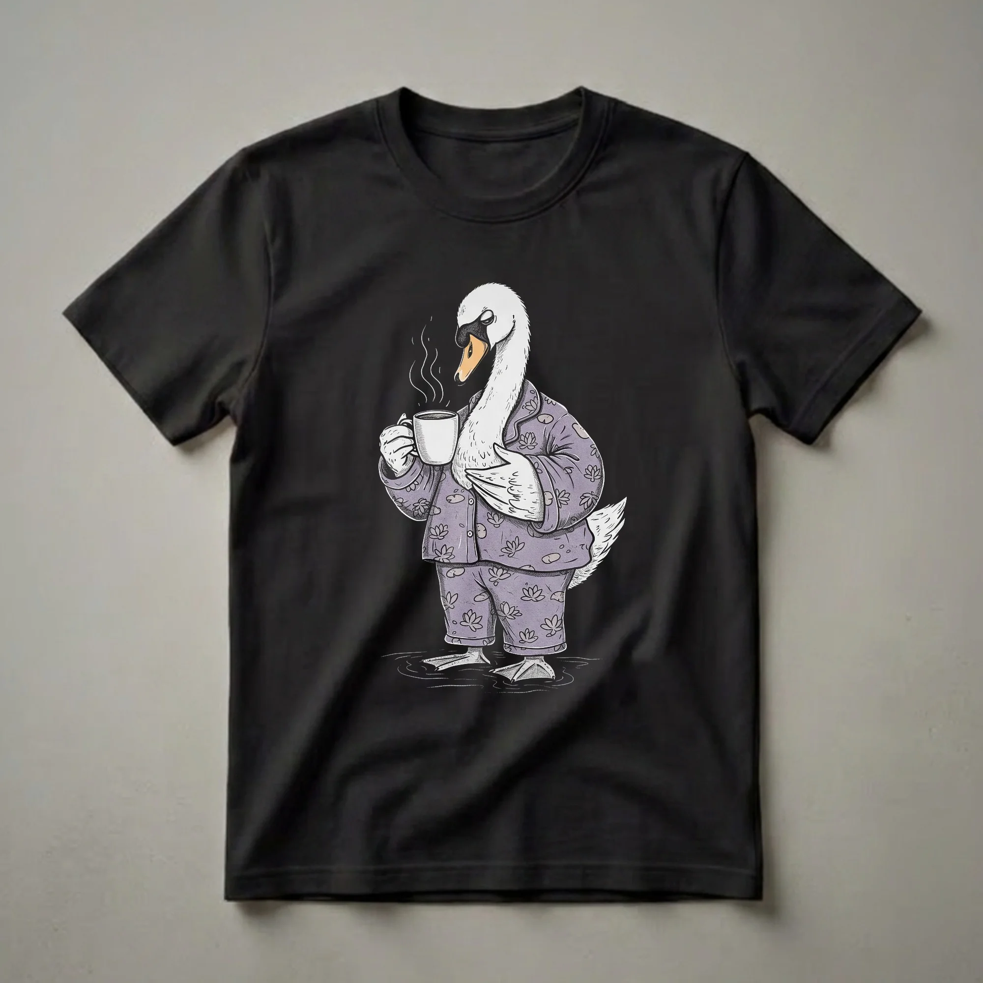 For those who understand the struggle of early mornings, this graphic tee features a charmingly depicted swan in full pajama attire, complete with a lotus flower pattern. The swan, a symbol of grace and beauty, is shown with its eyes half-closed, clutching a steaming mug of coffee. Swans are known for their elegant appearance and their tendency to form strong pair bonds, often seen gliding serenely on water. This t-shirt captures a relatable moment of a creature of elegance needing its morning caffeine fix. It's a staple for any coffee lover or anyone who identifies with the need for a warm beverage to kickstart their day. This shirt works well for anyone who enjoys a touch of humor in their loungewear or as a conversation starter. Imagine wearing this cozy tee on a lazy weekend morning, enjoying your own cup of coffee. It makes a thoughtful gift for friends or family members who are avian enthusiasts or simply appreciate a good laugh with their breakfast brew. This unique pajama-themed shirt is a go-to tee for relaxed mornings and cozy evenings.