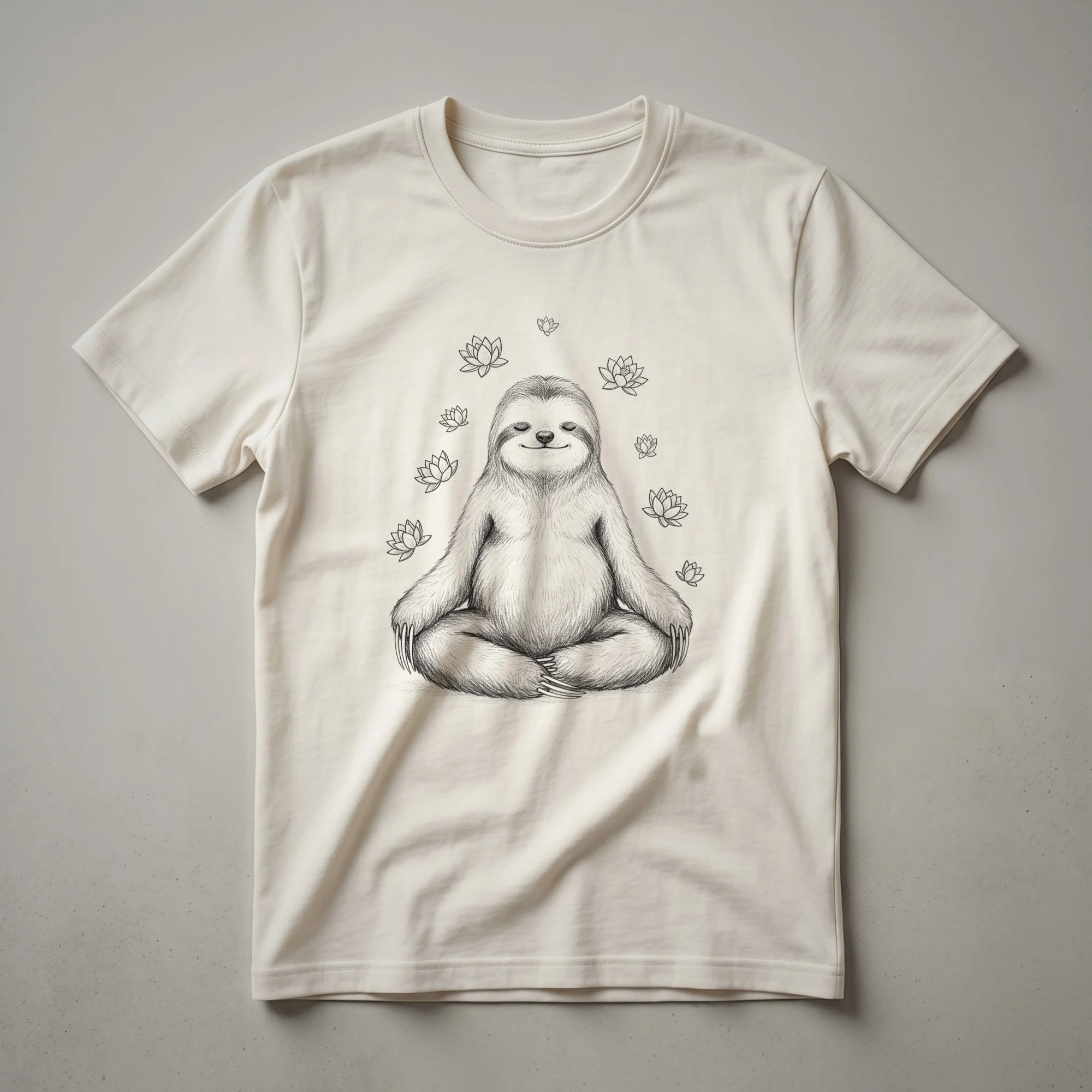 Yoga practitioners and meditation enthusiasts will reach for this unique t-shirt. The design showcases a sloth in a serene, meditative pose, nestled within a blooming lotus flower, symbolizing enlightenment and peace. This eye-catching graphic tee blends the calm of Buddhist philosophy with the gentle nature of sloths, known for their slow and deliberate movements. It's a staple in the collection for anyone who finds joy in mindfulness, yoga, or simply appreciating a moment of zen. This shirt works well for those who practice yoga, whether it's Vinyasa, Hatha, or restorative styles, encouraging a connection to inner calm. It makes a thoughtful gift for friends or family members who are dedicated to their wellness journey, offering a touch of whimsical spirituality. Wear it to your next yoga class, meditation session, or casual outing to share your peaceful vibes.