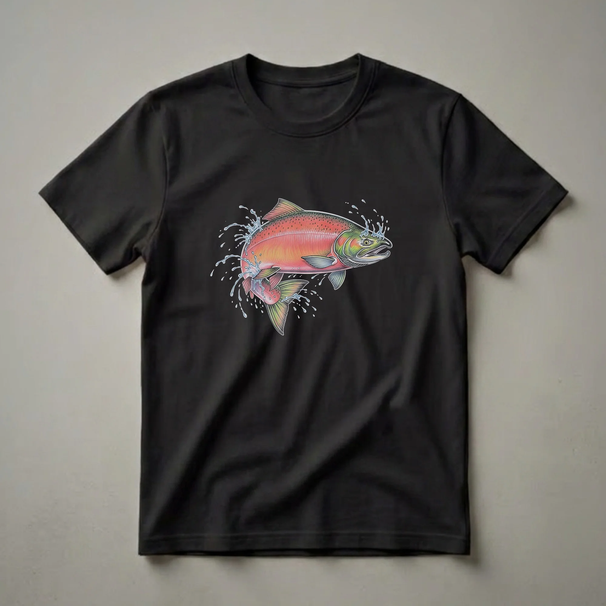- A striking sockeye salmon graphic tee for anglers and wildlife lovers.