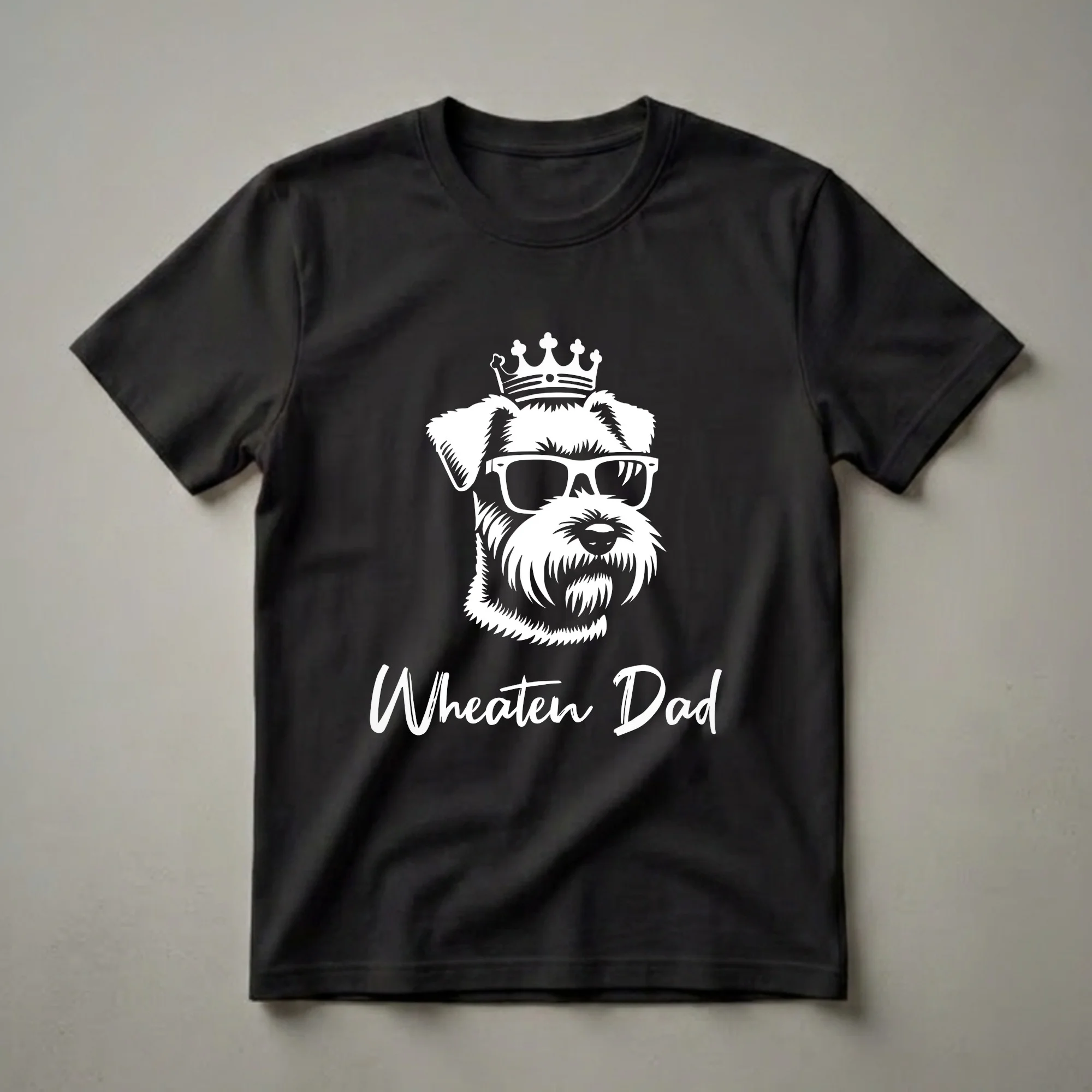 Wheaten Terrier dads know the unique joy and spirited personality that comes with owning this Irish breed. This graphic tee captures that proud connection with a striking white design on a black background. The artwork features a Soft Coated Wheaten Terrier sporting a regal crown and stylish sunglasses, exuding a cool and confident vibe. Below the dog's portrait, the text 'Wheaten Dad' is written in a bold, brush-stroke font, clearly identifying the wearer's special role. Soft Coated Wheaten Terriers, originating from Ireland, are known for their playful nature and distinctive silky, wheaten-colored coat. This shirt is a fantastic way for any dad who cherishes his Wheaten Terrier to express his love for his furry companion. It makes a thoughtful gift for birthdays, holidays, or just because. Wear this comfortable tee to dog parks, casual outings, or while relaxing at home with your beloved Wheaten. It's a staple in the collection for any proud Wheaten Dad.