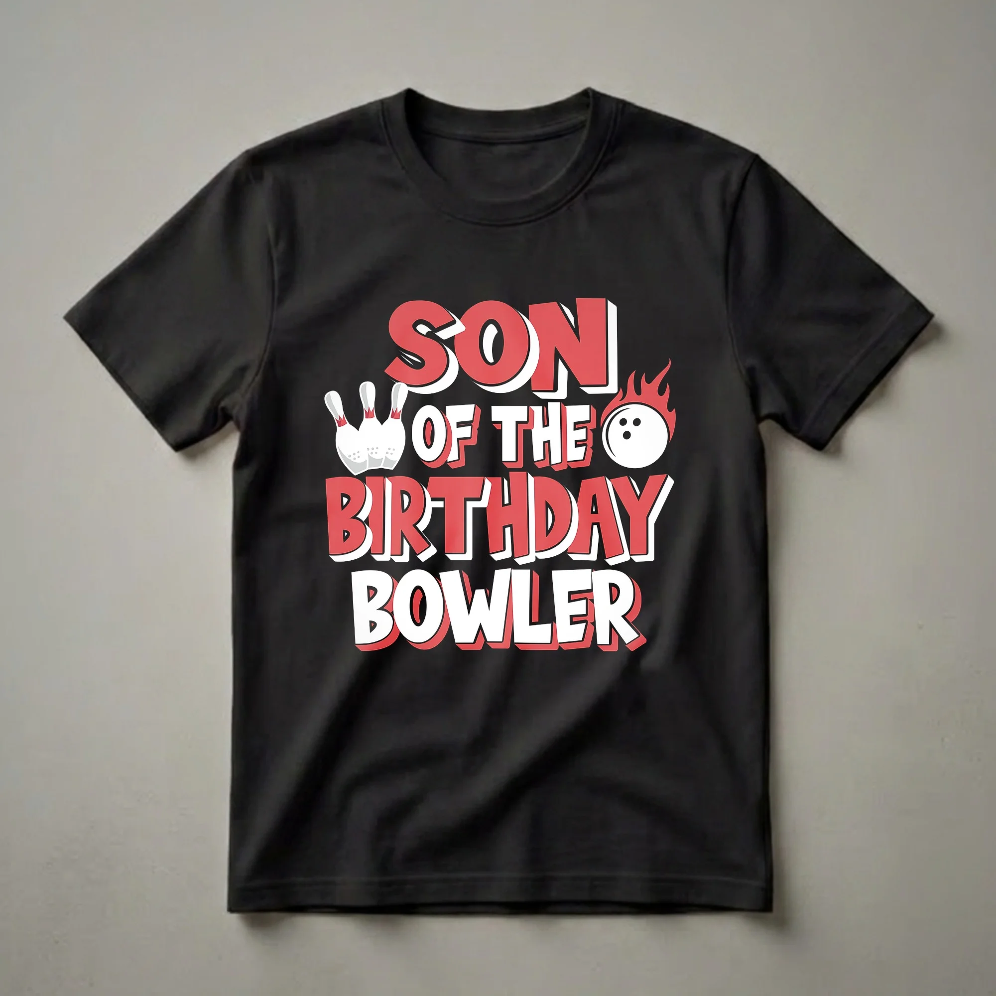 The son of the birthday bowler will proudly wear this eye-catching graphic tee. The design features bold, stylized red and white lettering that spells out "SON OF THE BIRTHDAY BOWLER." Flanking the text are iconic bowling elements: a trio of white bowling pins with red accents on the left, and a flaming bowling ball on the right. This shirt is a fantastic way for the son to show support for the birthday person during their celebration. Bowling is a sport with a rich history, enjoyed by people of all ages, and this shirt captures the fun spirit of a bowling birthday party. It makes a thoughtful gift for any young man whose mother or father is celebrating a birthday and enjoys hitting the lanes. Imagine him wearing this t-shirt to the bowling alley for the birthday bash, or even just out and about, showcasing his connection to the birthday bowler. This apparel is a great conversation starter and a fun way to commemorate a special birthday occasion. It's a staple for any son attending a bowling-themed birthday event.