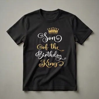 The Son of the Birthday King is ready to celebrate in style with this eye-catching graphic tee. The design features a regal gold crown positioned above bold, flowing script text. The words 'Son of the' are rendered in crisp white, while 'the Birthday King' shines in a luxurious gold gradient, complete with subtle heart embellishments. This t-shirt is a fantastic way for any young boy to show his pride on his father's special day or as part of a coordinated family birthday theme. Imagine the birthday king and his son twinning for the celebration, creating memorable photo opportunities. This shirt works well for any birthday party, family gathering, or casual outing where a touch of royal flair is desired. It makes a thoughtful gift for a son whose father is being celebrated, or for a young boy who loves to feel like royalty. This graphic tee is a staple for any birthday celebration, ensuring the son of the king is recognized and celebrated alongside his dad. It's a fun way to mark the occasion and create lasting memories.