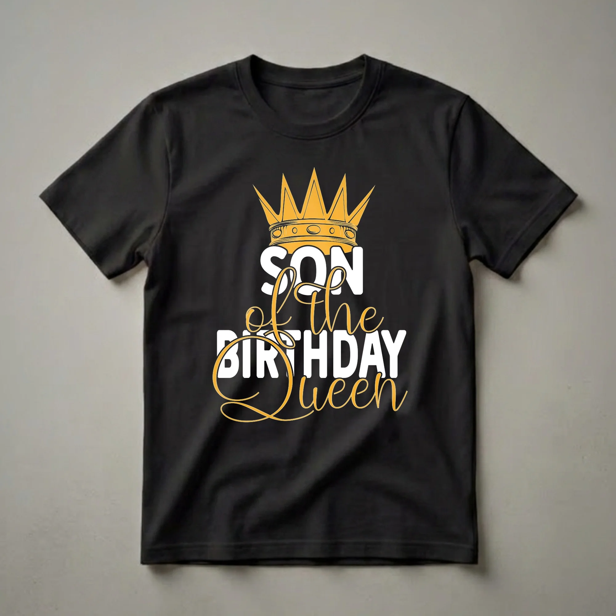 - Features a regal golden crown above bold white lettering proclaiming 'SON of the BIRTHDAY Queen'.