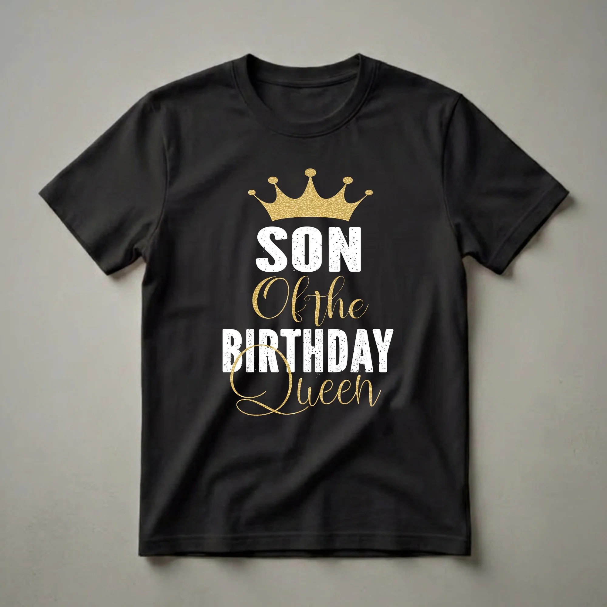 The birthday celebration is all about honoring the queen of the day, and this graphic tee proudly declares the role of her son. The design features a striking gold crown with a textured, bubbly pattern, symbolizing royalty and prestige. Below the crown, the words "SON" are displayed in bold, distressed white capital letters, giving it a vintage, worn-in feel. The phrase "Of the" is written in an elegant, flowing script in a shimmering gold, adding a touch of sophistication. Completing the message, "BIRTHDAY Queen" is presented in large, distressed white capital letters, mirroring the style of "SON." This t-shirt is a fantastic way for the birthday queen's son to show his pride and be part of the festive occasion. It makes a thoughtful gift for any son whose mother is celebrating a milestone birthday, a special anniversary, or just wants to feel like royalty on her big day. This shirt works well for birthday brunches, family gatherings, or casual wear during the birthday festivities. It's a staple piece for any son wanting to join in the birthday queen's celebration.