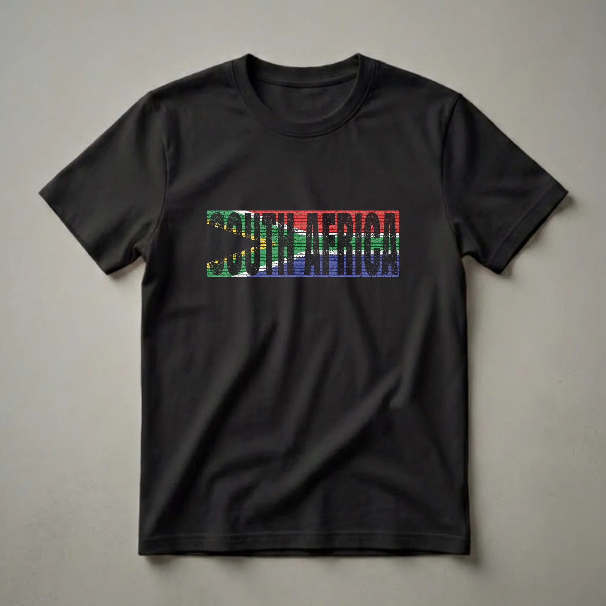South African heritage is celebrated on this distressed graphic tee, featuring the iconic flag colors of red, green, blue, black, white, and yellow. The bold black lettering of 'SOUTH AFRICA' is overlaid with a vintage, textured effect, making it a striking statement piece. This shirt is a wonderful way for South Africans, expats, or anyone with a connection to the country to display their pride. The design evokes a sense of national identity and belonging. It's a thoughtful gift for friends or family who cherish their South African roots. Wear this shirt to cultural events, gatherings with fellow countrymen, or simply as a daily reminder of your homeland. The vibrant colors and distressed look give it a unique, lived-in feel, symbolizing a deep connection to the nation's history and spirit. This apparel is a staple for anyone wanting to showcase their South African pride.