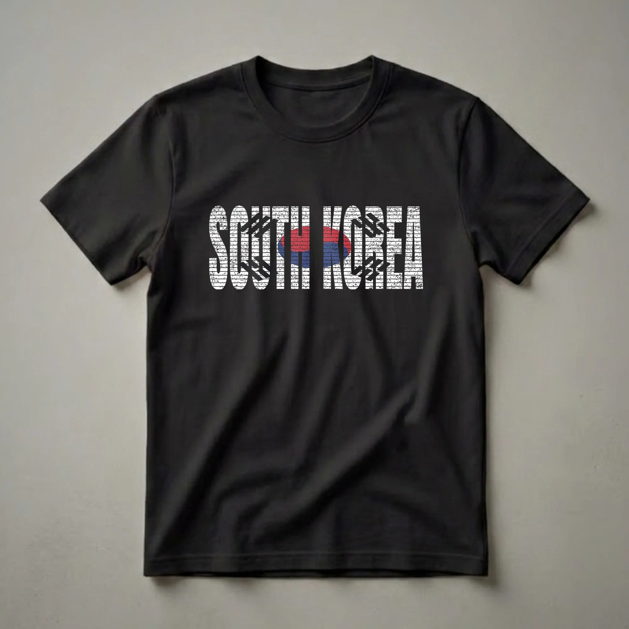 South Korean heritage is celebrated on this striking graphic tee, featuring the bold white text "SOUTH KOREA" with a distressed, vintage aesthetic. The iconic Taegeukgi, the flag of South Korea, is prominently displayed within the letters of "KOREA," symbolizing the nation's vibrant spirit. The flag's design, with its red and blue yin-yang symbol and black trigrams, represents balance and harmony. This shirt is a fantastic way for individuals of Korean descent, whether living in the diaspora or within the country, to express their national identity and pride. It serves as a thoughtful gift for friends, family, or anyone who cherishes their connection to South Korea. Wear this t-shirt to cultural festivals, family gatherings, or simply as a daily reminder of your roots. The vintage look adds a touch of timeless appeal, making it a go-to tee for expressing national pride with style. This apparel is a staple for those who want to carry a piece of their homeland with them.