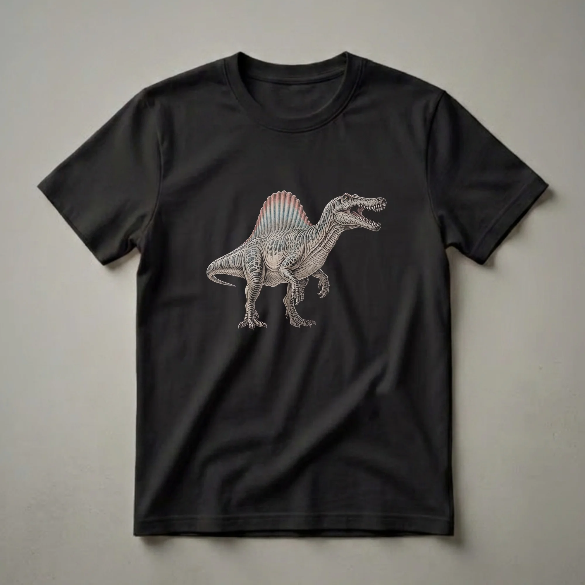 Paleontology enthusiasts will appreciate this striking t-shirt featuring a detailed, vintage-style drawing of a Spinosaurus. This impressive dinosaur, known for its distinctive sail on its back, roamed North Africa during the Cretaceous period, approximately 95 to 100 million years ago. The artwork captures the Spinosaurus in a dynamic pose, showcasing its powerful build and sharp teeth. This graphic tee is a fantastic way for dinosaur lovers to express their fascination with these ancient reptiles. It's a staple in the collection for anyone who enjoys natural history and prehistoric life. This shirt works well for casual wear, museum visits, or as a thoughtful gift for the dinosaur aficionado in your life. Wear it to your next fossil dig or simply to share your passion for the Mesozoic era.