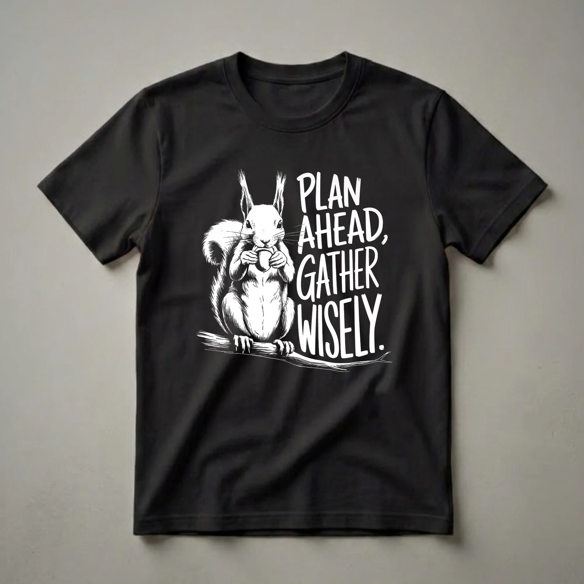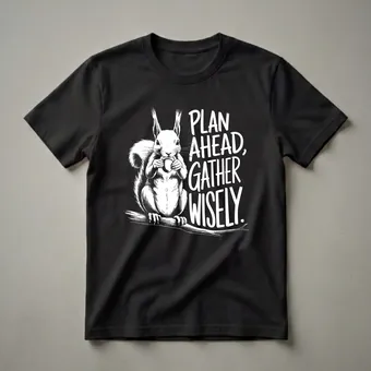 Squirrel moms and dads who appreciate the industrious nature of these woodland creatures will reach for this unique tee. The design showcases a detailed, white ink sketch of a squirrel perched on a branch, meticulously holding an acorn. Bold, brush-stroke lettering proclaims, "PLAN AHEAD, GATHER WISELY." This sentiment reflects the natural behavior of squirrels, which are known for their diligent food caching, a vital survival strategy, especially for species like the red squirrel found across Eurasia and parts of Asia. These agile rodents are often seen burying nuts and seeds to ensure sustenance through leaner months, a behavior that inspires this shirt's message. This graphic tee is a thoughtful gift for any nature lover, hiker, or wildlife enthusiast who admires the resourcefulness of forest dwellers. Wear it on your next nature walk, to a casual gathering, or simply when you want to express your connection to the wild. It's a staple in the collection for anyone who understands the importance of preparation and foresight, just like their favorite furry forest friend.