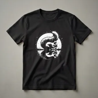 Squirrels are known for their agility and their presence in forests and urban parks alike. This eye-catching graphic tee features a detailed illustration of a squirrel, its form mirrored in the calm water below. The design is rendered in a striking black and white style, with a circular motif and scattered dots that evoke a starry night or a misty atmosphere. Squirrels, belonging to the family Sciuridae, are often observed foraging for nuts and seeds, and their bushy tails are a distinctive characteristic. This t-shirt works well for anyone who appreciates the beauty of wildlife and the natural world. It makes a thoughtful gift for hikers, nature photographers, or anyone who enjoys observing these busy mammals in their habitat. Wear this shirt on your next outdoor adventure or casual outing to express your connection with the wild. The unique reflective art design captures the serene moment of a squirrel by the water, making it a standout piece for any nature lover's wardrobe. This graphic shirt is a great way to celebrate the charm of these common yet captivating woodland inhabitants.