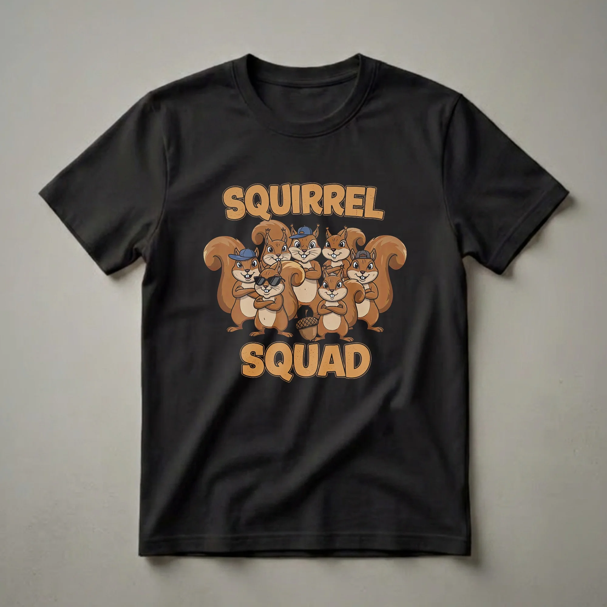 Kids who adore woodland creatures will love this "Squirrel Squad" graphic tee. The design features a group of seven cartoon squirrels, each with its own personality. One squirrel sports cool sunglasses, another wears a blue baseball cap, and a third sports a black baseball cap. They are all depicted with their arms crossed, exuding a playful, confident vibe. An acorn sits at the center of the group, a nod to their favorite snack. Squirrels, known for their agility and bushy tails, are common inhabitants of parks and forests, often seen gathering nuts. This t-shirt is a fantastic way for a child to express their love for these energetic animals. It makes a thoughtful gift for any child's birthday, especially for those turning ages 5 to 9 who are fascinated by animals. This shirt is a go-to for casual wear, playdates, or even a birthday party. The "Squirrel Squad" text is presented in a bold, distressed font, adding a touch of retro style to the overall design. This fun shirt is sure to be a hit with any young animal enthusiast.