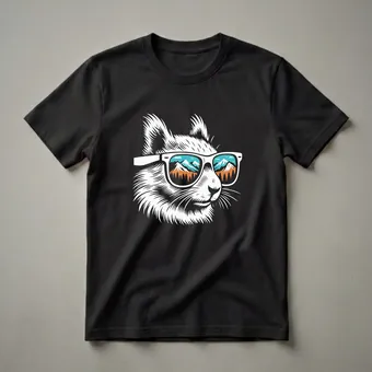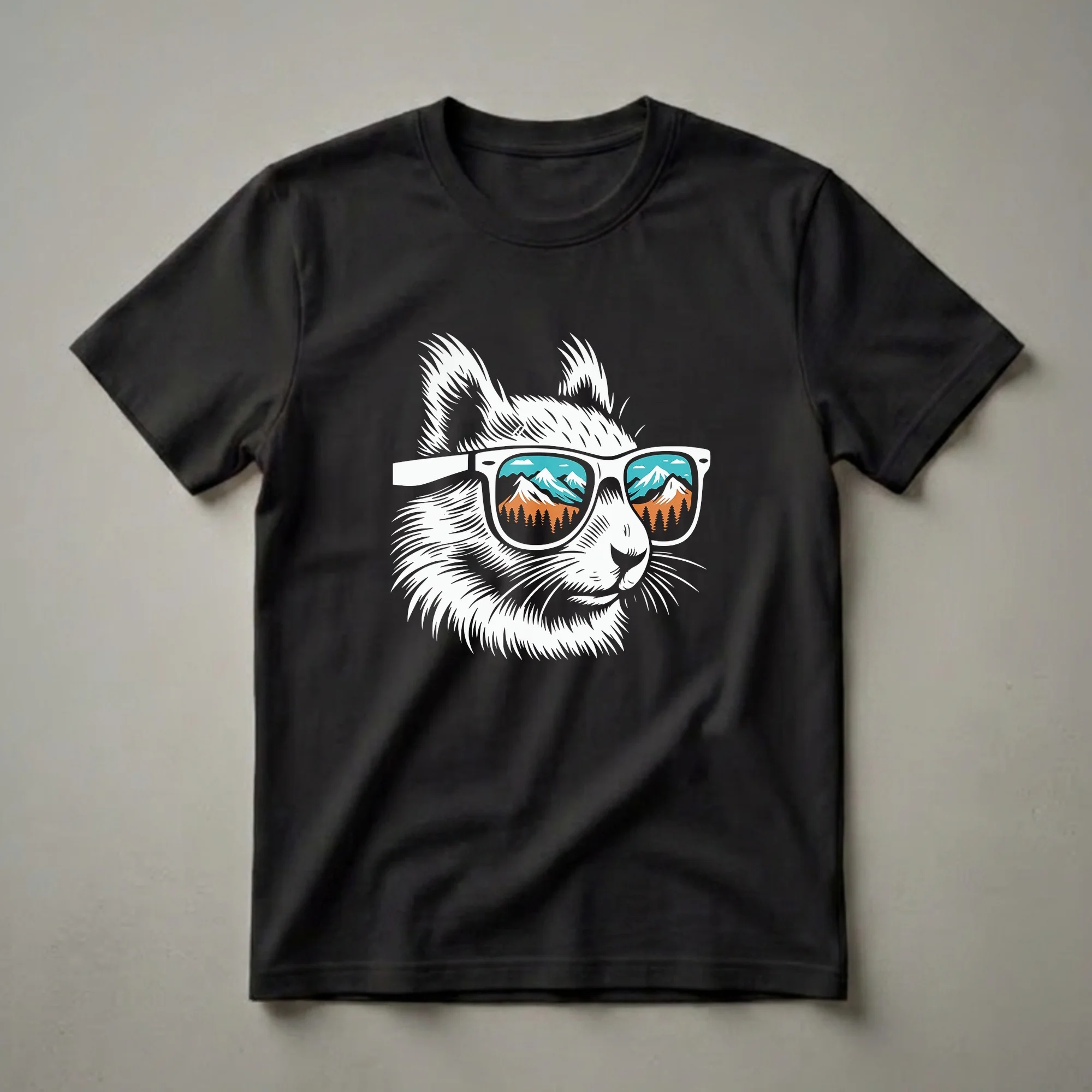 Nature lovers and hikers will reach for this unique graphic tee featuring a striking woodcut-style illustration of a squirrel. The squirrel wears cool white sunglasses, and the lenses reflect a vibrant mountain landscape complete with snow-capped peaks, pine trees, and a bright blue sky with clouds. Squirrels, known for their agility and presence in woodland environments, are often seen scampering through forests and mountains, making this design a fitting tribute to their wild spirit. This t-shirt makes a thoughtful gift for anyone who appreciates wildlife and the great outdoors. Wear it on your next hike, to a casual gathering, or simply when you want to showcase your love for nature. This shirt is a staple in the collection for outdoor enthusiasts.