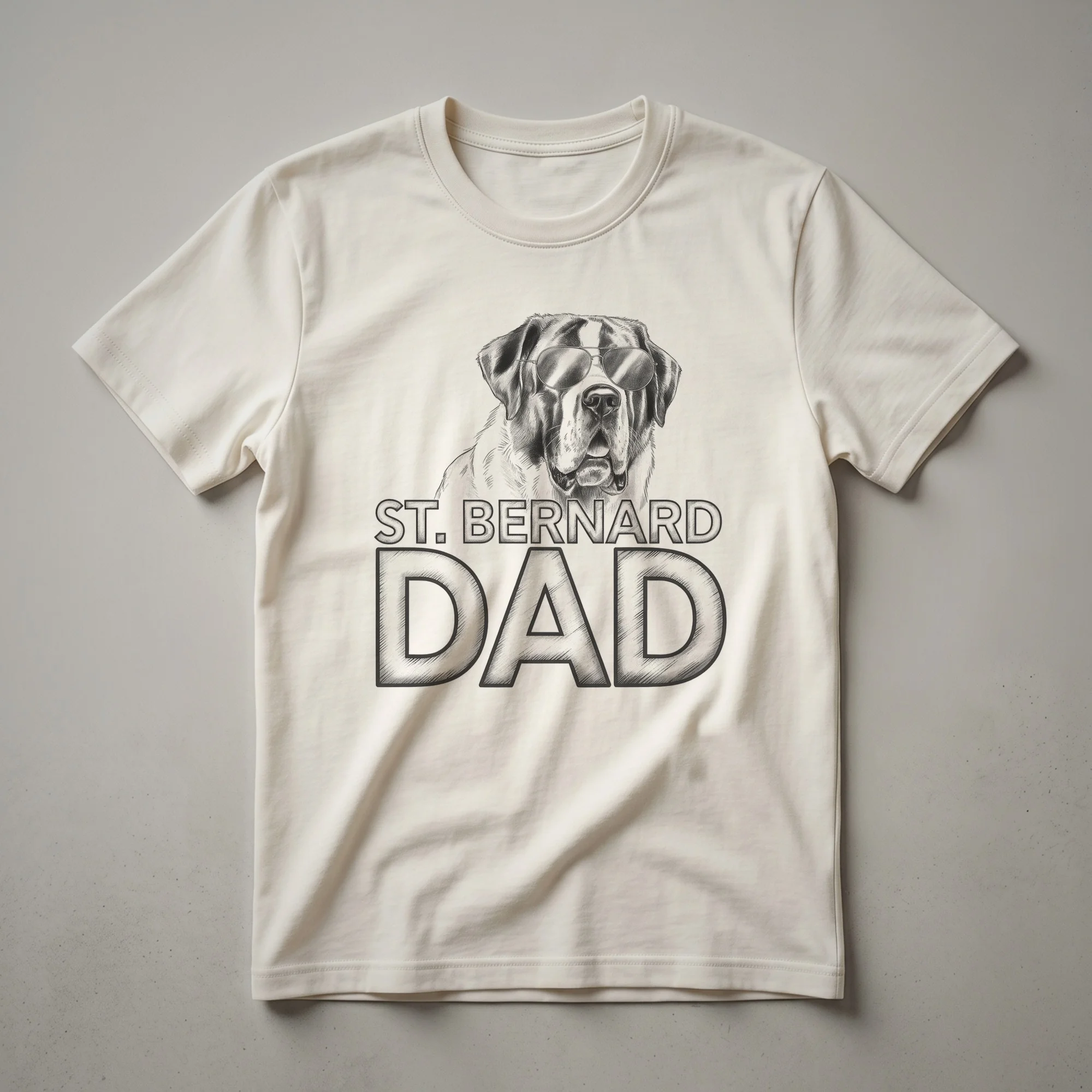 St. Bernard dads who want to wear their affection for their gentle giants will reach for this unique t-shirt. The design features a striking illustration of a St. Bernard dog, known for its impressive size and calm demeanor, nestled amongst a vibrant floral arrangement. The word 'Dad' is prominently displayed, clearly identifying the wearer's proud role. This eye-catching graphic tee is more than just apparel; it's a statement of the special bond between a man and his beloved canine companion. St. Bernards, originally bred in the Swiss Alps for rescue work, are renowned for their friendly nature and loyalty, making them truly exceptional pets. This shirt makes a thoughtful gift for any dog owner celebrating their role as a St. Bernard dad, perhaps for a birthday or Father's Day. Wear it to your next dog park visit or casual outing to spark conversations with fellow dog lovers.