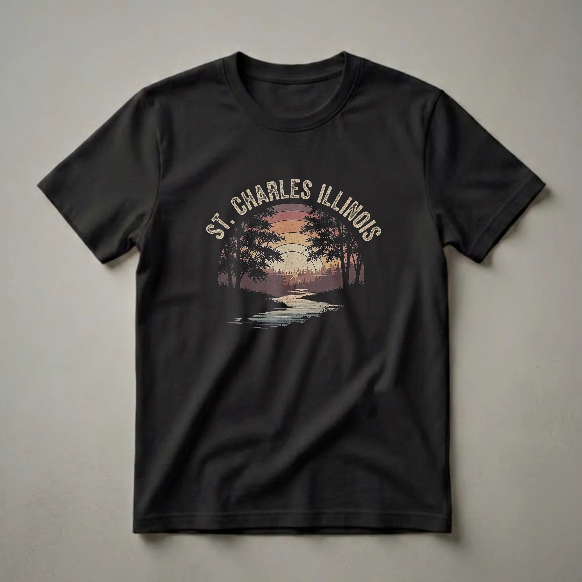 St. Charles, Illinois residents and visitors can now wear their pride with this striking retro graphic tee. The design captures the serene beauty of a sunset over a winding river, framed by silhouetted trees and lush foliage. The warm hues of the sunset, depicted in concentric arcs, evoke a sense of nostalgia and the peaceful ambiance of the Fox River, which flows through St. Charles. This t-shirt is more than just apparel; it's a wearable piece of art celebrating the charm of this Illinois city. The graphic style, reminiscent of vintage travel posters, makes it a unique addition to any wardrobe. It's a thoughtful gift for anyone who calls St. Charles home or has fond memories of visiting. Imagine wearing this shirt on a casual outing, a walk along the riverfront, or to a local gathering, sparking conversations about your favorite Illinois town. This comfortable tee is a go-to choice for expressing local pride with a touch of retro flair. The detailed artwork, with its textured finish and muted color palette, offers an eye-catching look that stands out.