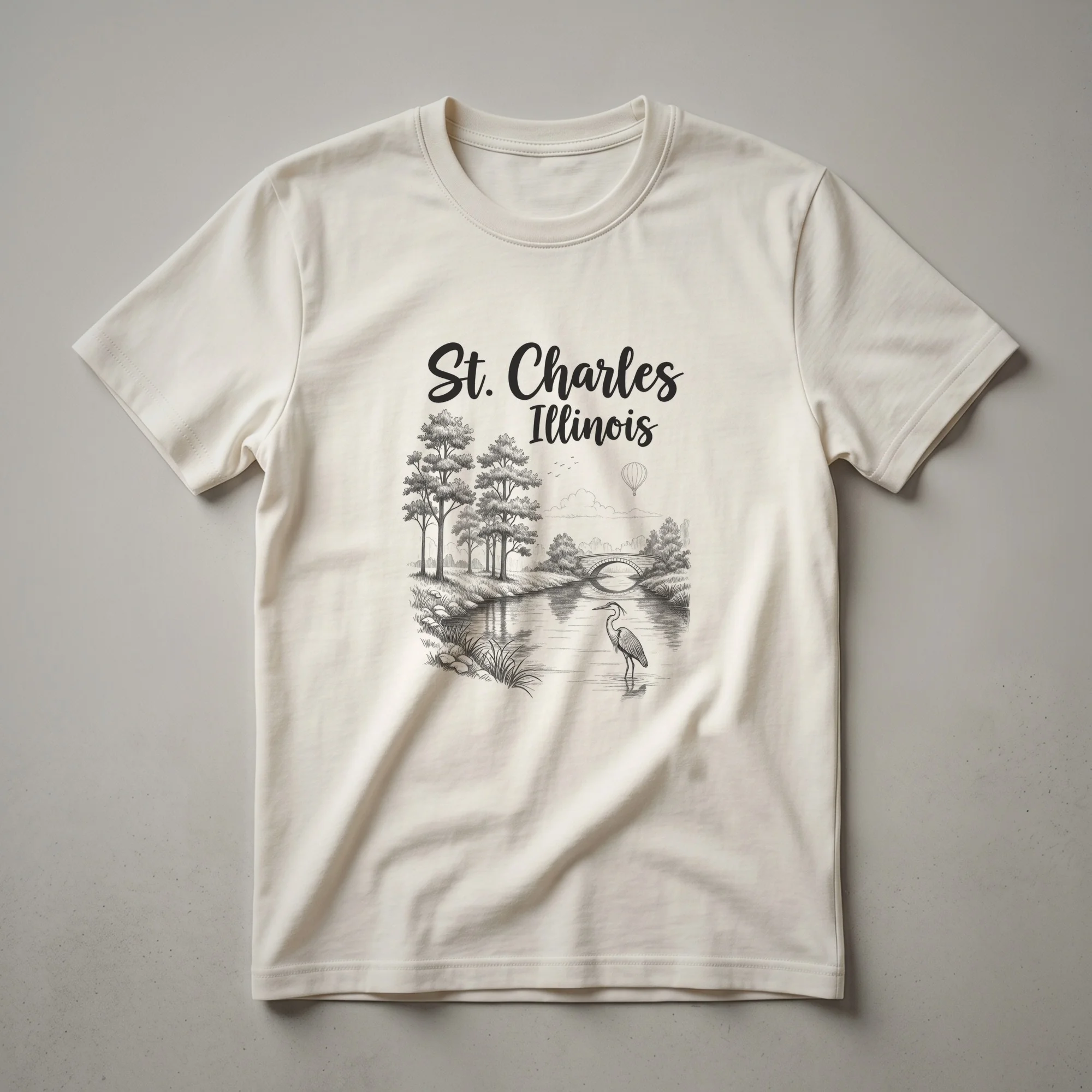 St. Charles, Illinois residents who appreciate the charm of their hometown will reach for this unique graphic tee. The design captures a tranquil scene, featuring a sketch-art rendering of a picturesque landscape. Tall trees line the bank of a calm body of water, where a graceful heron stands, reflecting in the still surface. In the background, an arched bridge spans the water, hinting at the town's scenic beauty. A hot air balloon drifts in the sky above, adding a touch of whimsy to the composition. This shirt is a thoughtful gift for anyone who calls St. Charles home or has fond memories of visiting this Illinois gem. It's a great way to wear your local pride, whether you're out for a casual stroll along the Fox River or attending a local event. The detailed sketch style offers a sophisticated yet casual aesthetic, making this t-shirt a versatile addition to any wardrobe. Celebrate the unique character of St. Charles, Illinois with this eye-catching apparel.