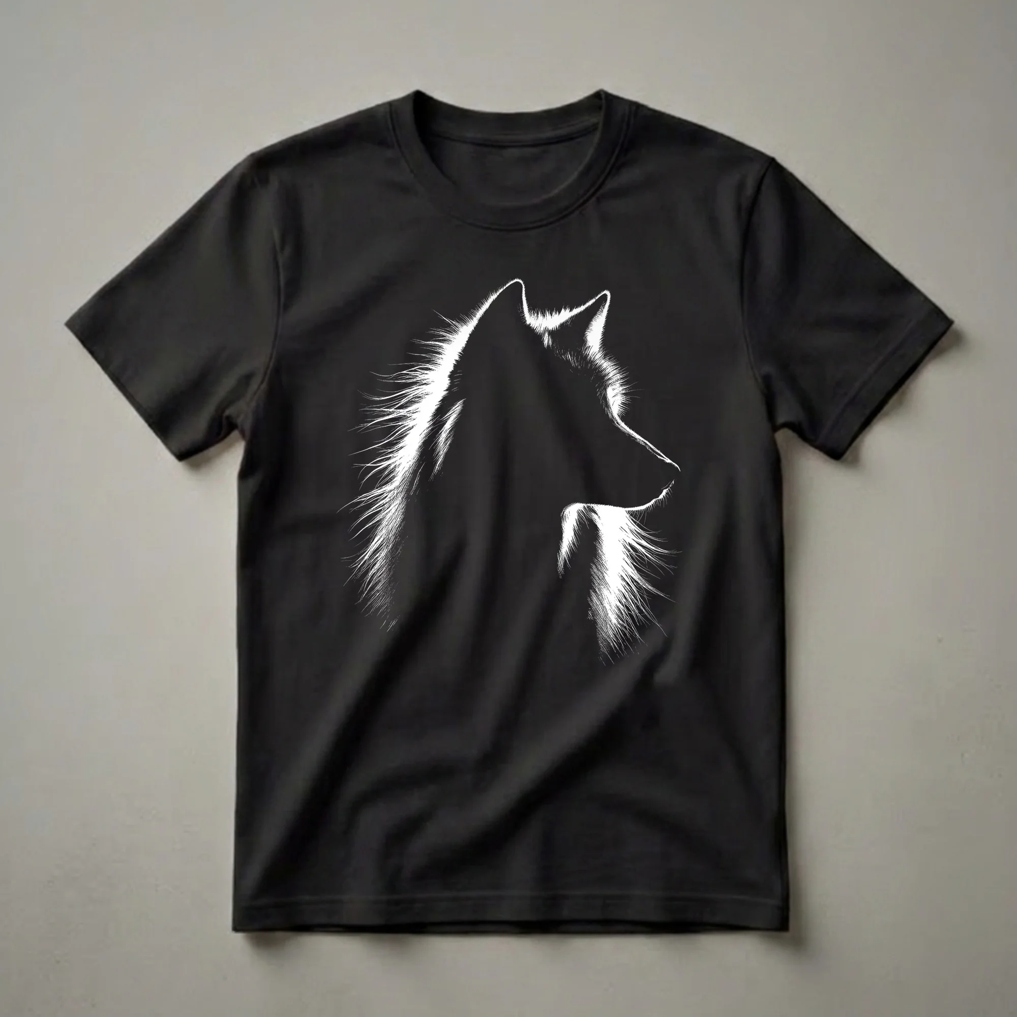Wolf enthusiasts who appreciate the wild spirit of these canids will reach for this eye-catching graphic tee. The design features a stark, high-contrast silhouette of a wolf's head in profile, rendered with a textured, stippled effect that gives the impression of wind-blown fur. This artistic interpretation captures the noble and untamed essence of the wolf, a creature known for its intelligence and pack loyalty. Wolves, scientifically classified as Canis lupus, inhabit diverse environments across the Northern Hemisphere, from dense forests to open tundras, and are often symbols of freedom and the wilderness. This shirt is a thoughtful gift for anyone who admires these magnificent animals, whether they are hikers, nature photographers, or simply appreciate unique animal art. It's a conversation starter, a thoughtful choice for casual outings, game nights, or simply lounging at home while celebrating your connection to the natural world. This t-shirt offers a bold statement for those who feel a kinship with the wolf's powerful presence.